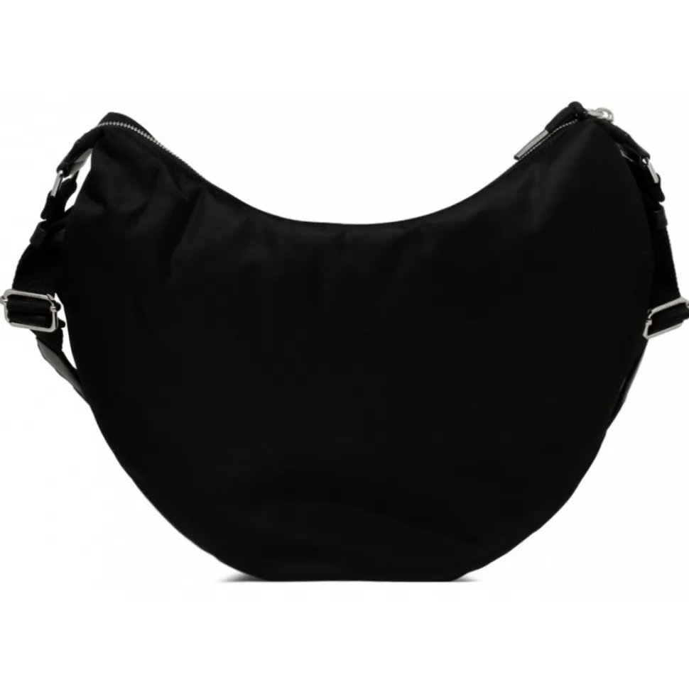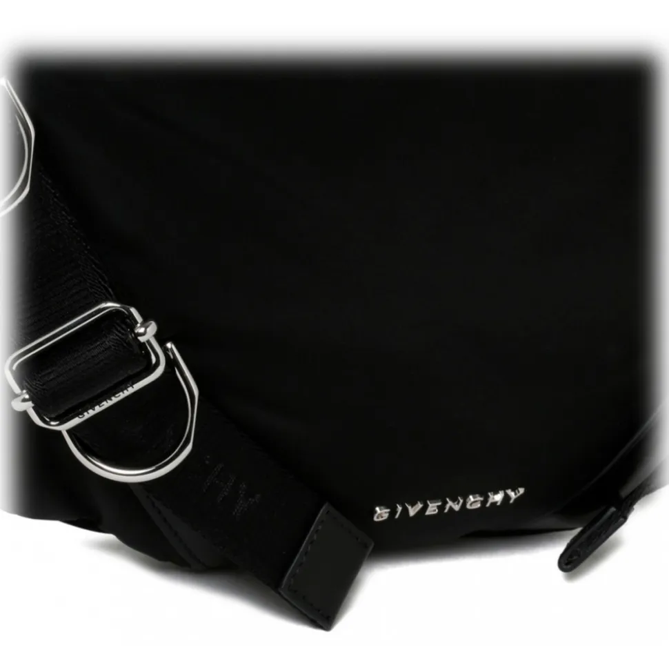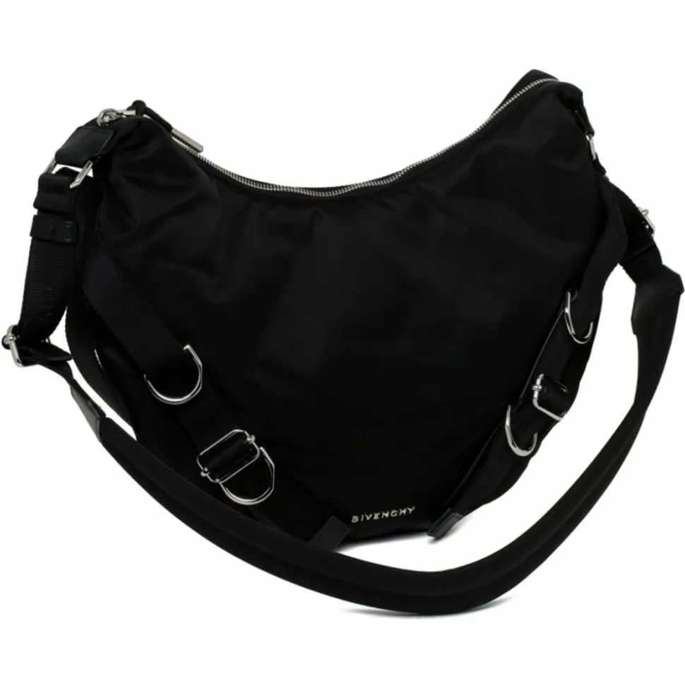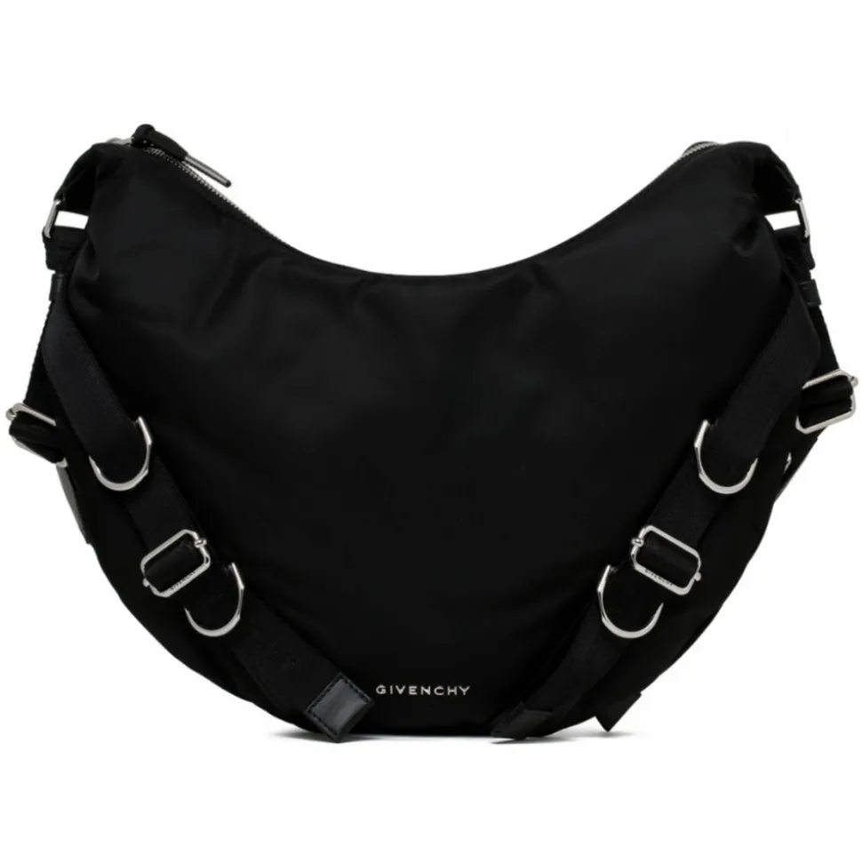 Givenchy Black Voyou Crossbody Bag. Black crossbody bag in nylon, adjustable Givenchy webbing shoulder strap, brand signature engraved metal buckles. Silvery finish metal details, metal Givenchy signature on the front of the bag, one main compartment and one inside flat pocket.