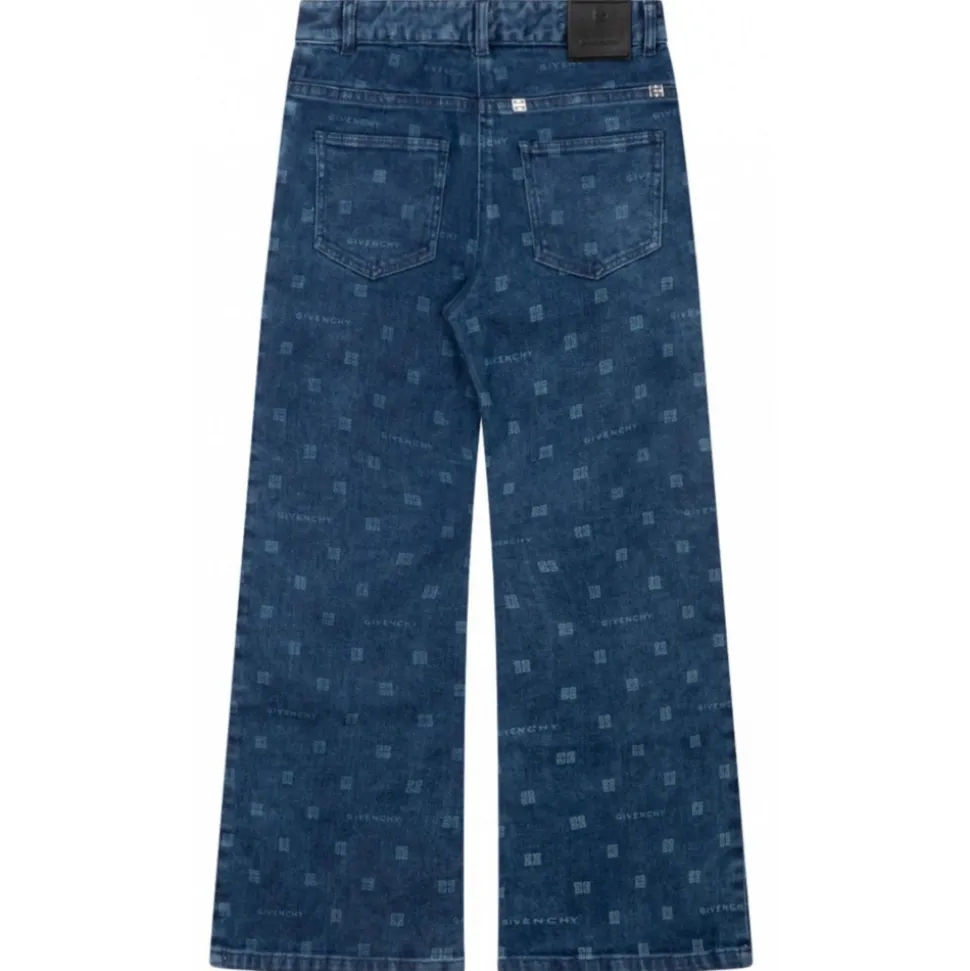 Givenchy Kids Blue 4G Wide Leg Jeans. Blue stretch cotton jeans, signature 4G motif, Belt loops, classic five pockets and wide leg.