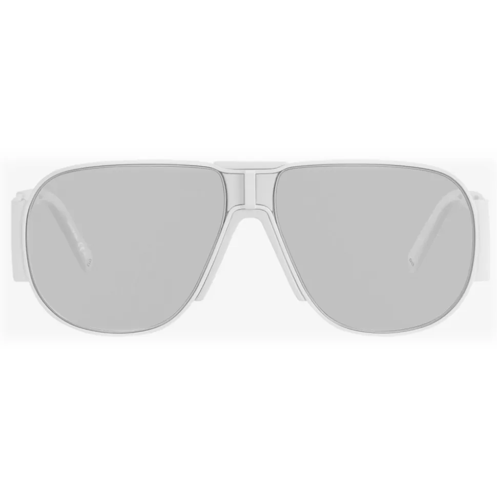 GV Vision unisex aviator sunglasses with rounded frame and temples in white metal, graphic bridge, light gray glass inserts on the temples, light gray lenses, and white acetate tips. UV protection rating XX. Sunglasses come in a hard case.