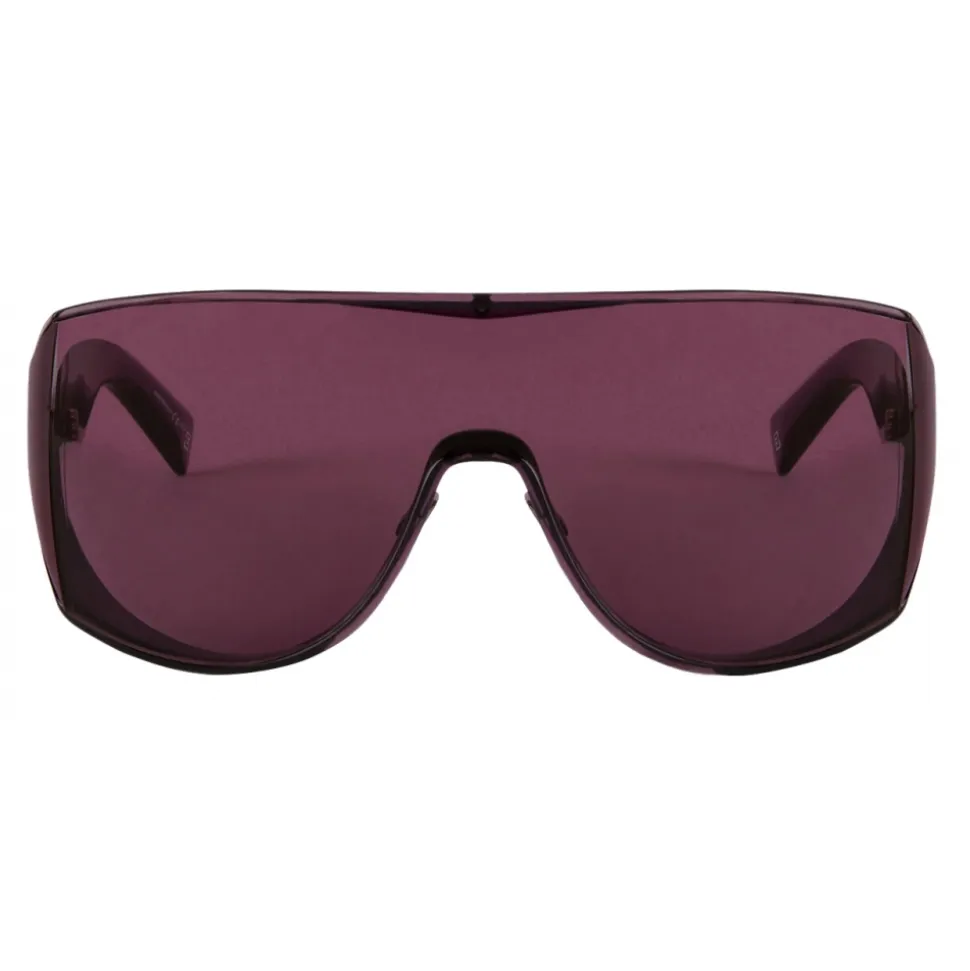 GVisible unisex sunglasses with mask frame in clear purple injected acetate, purple lenses with 180-degree vision, metal nose pads and raised GIVENCHY signature on the temples. UV protection rating 2. Sunglasses come in a hard case.