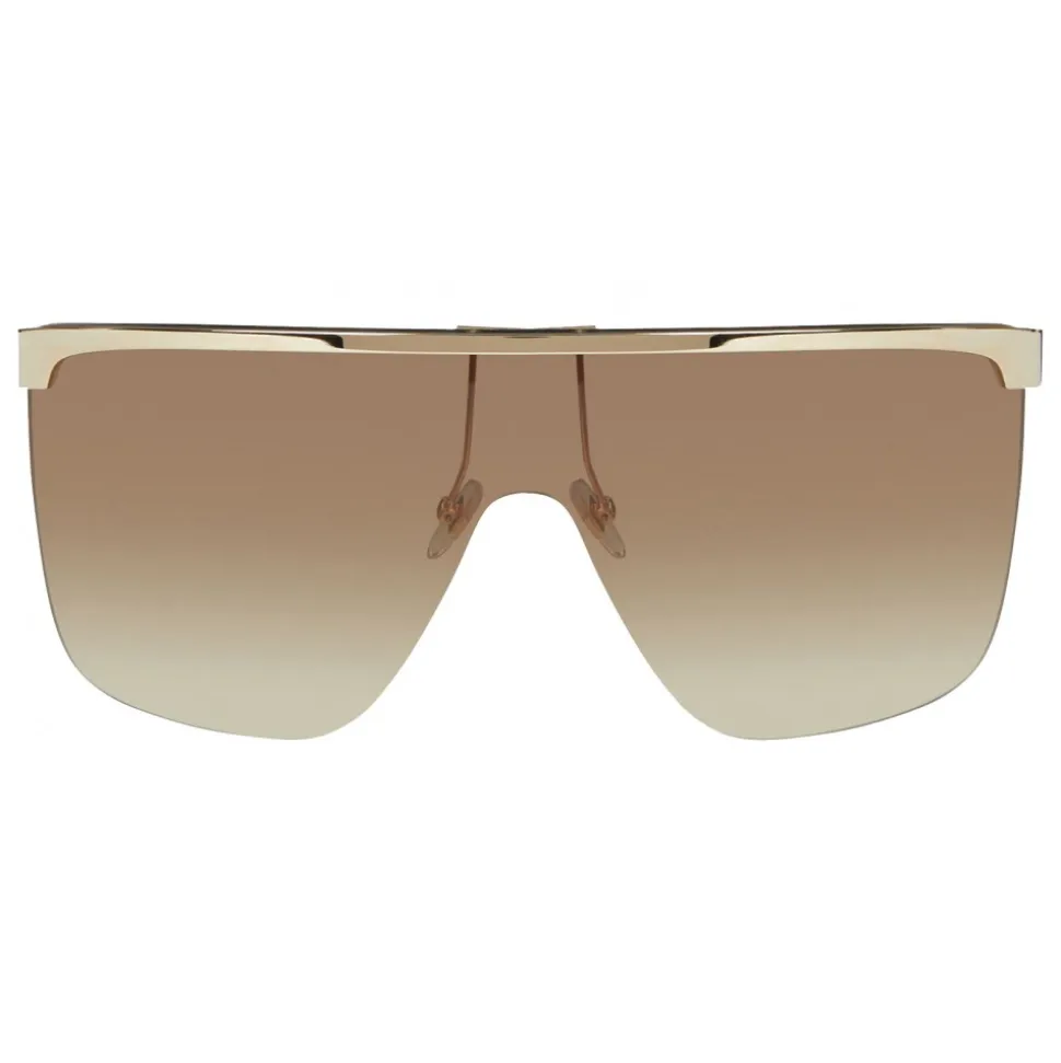 Masked sunglasses with shaded brown lenses, temples and metal bridge with gold finish. Givenchy brand on temples and ends in dark tortoise acetate.