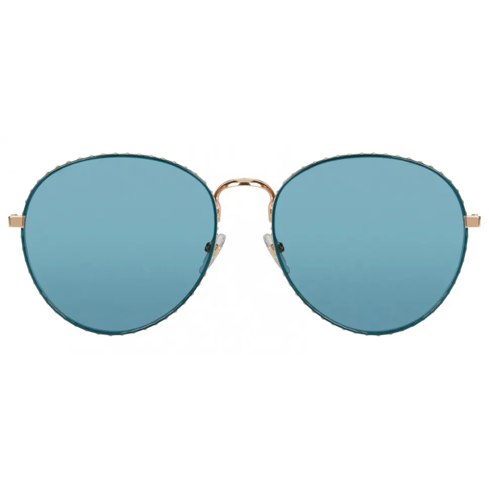 Metal sunglasses with a pink gold finish, green anti-glare lenses and small green decorative studs. Terminals in transparent acetate.