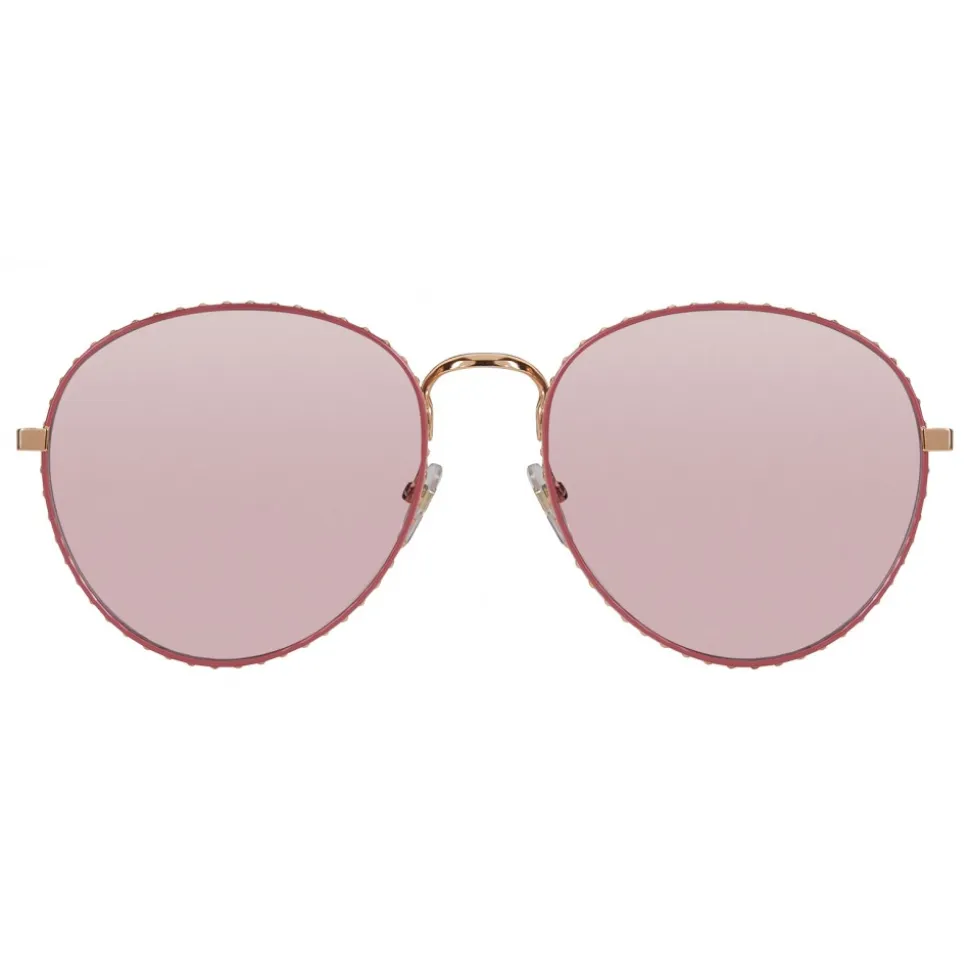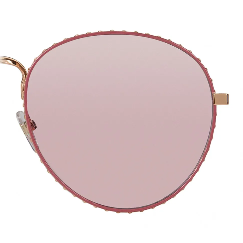 Metal sunglasses with rose gold finish, pink anti-reflection lenses and small pink decorative studs. Terminals in transparent acetate.
