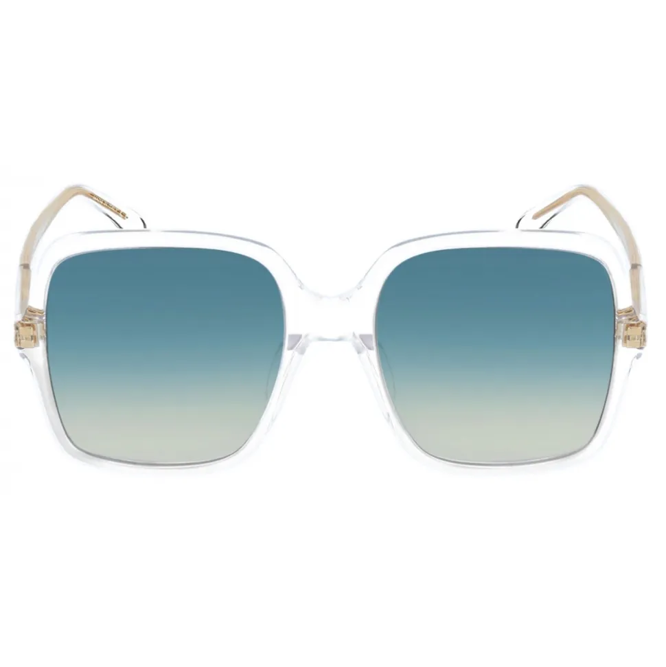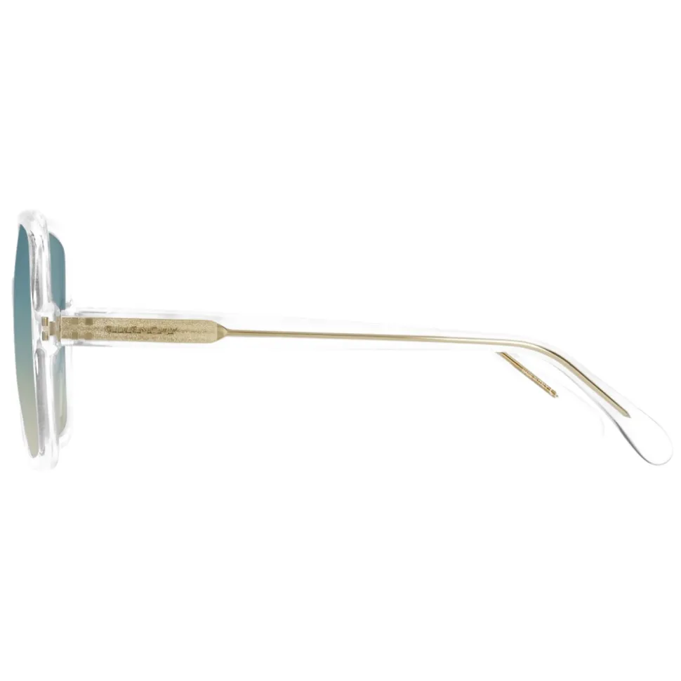 GV Essence sunglasses in crystal acetate with square frame, and gradient pink and blue lenses. Temples with gold metal insert with GIVENCHY signature and 4G Square emblem. UV protection rating 2. Sunglasses come in a hard case.