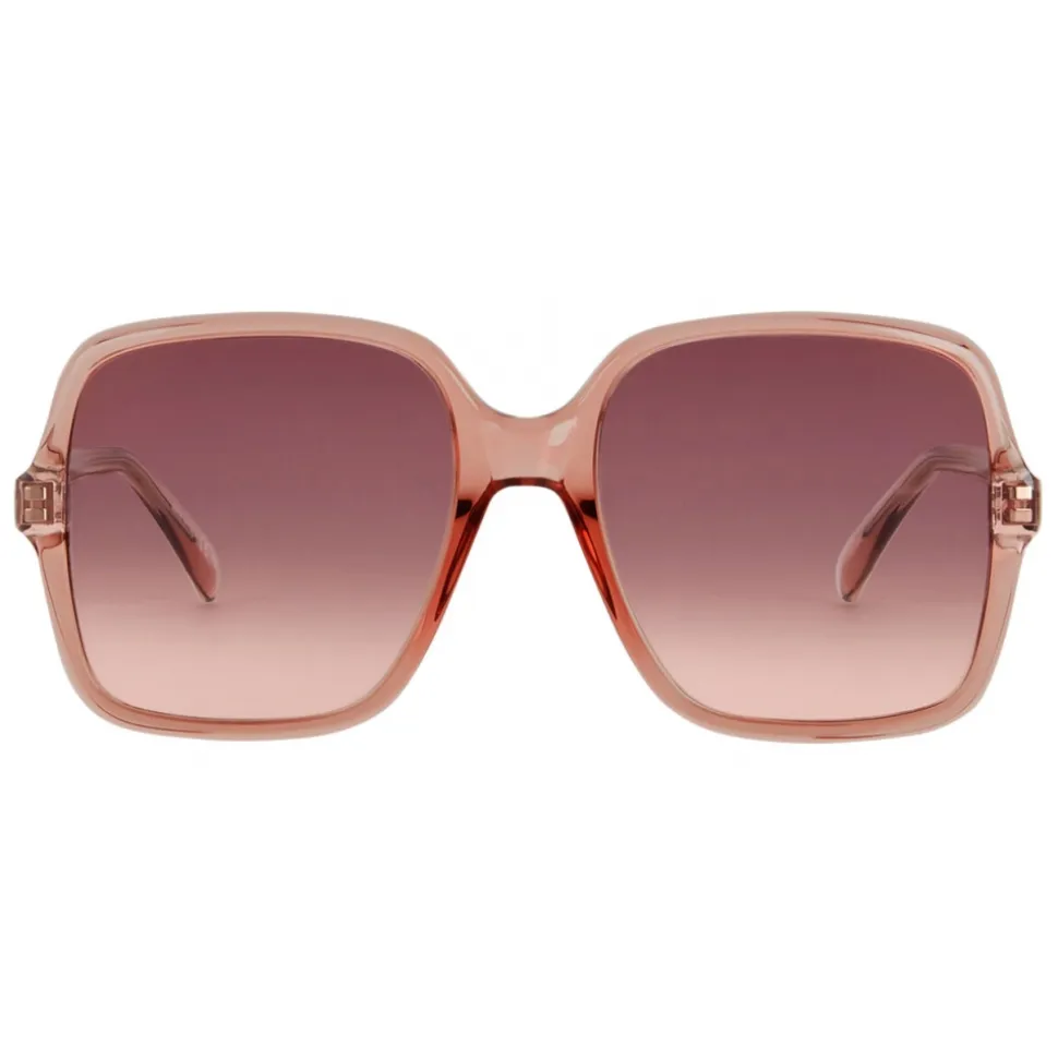 GV Essence sunglasses in transparent pink acetate with square frame, and burgundy ombre lenses with gold mirrored effect. Temples with palladium-finish metal insert with GIVENCHY signature and 4G Square emblem. UV protection rating 2. Sunglasses come in a hard case.