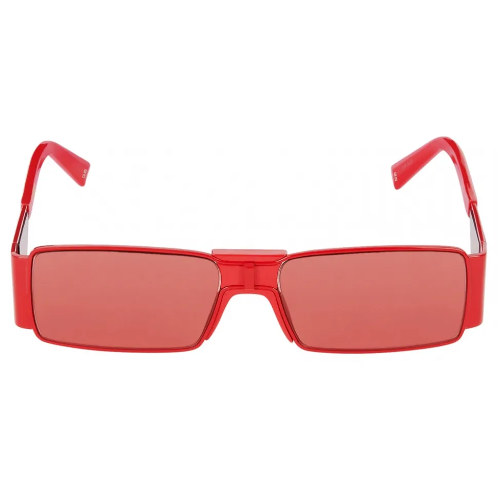 GV Vision futuristic sunglasses with rectangular frame and temples in red metal, graphic bridge, pink nylon inserts on the temples and pink lenses. UV protection rating 3. Sunglasses come in a hard case.