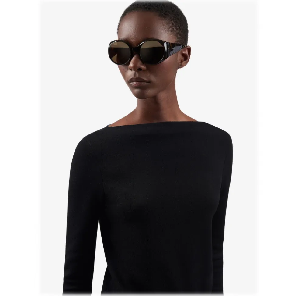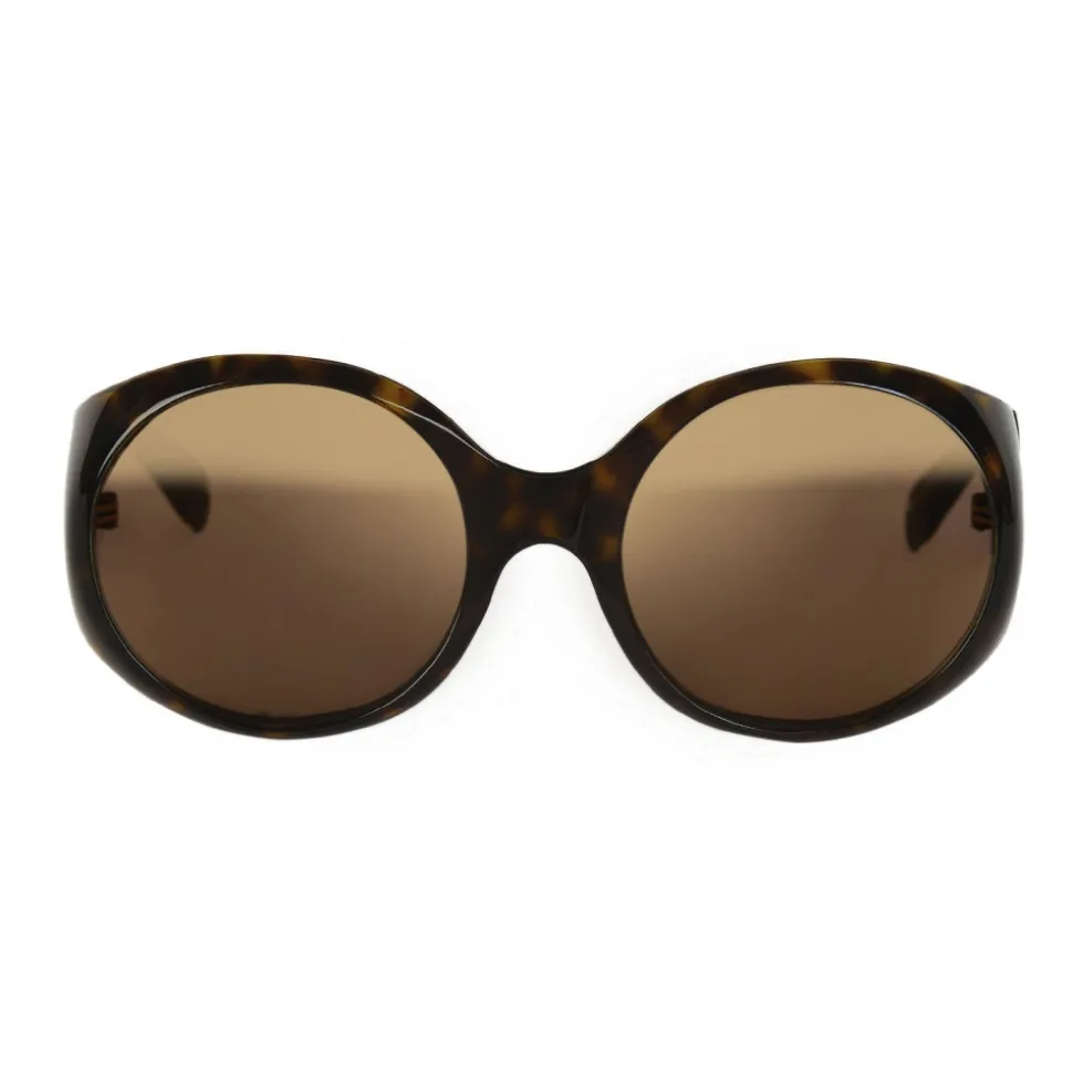 Round 4G Square women’s sunglasses in dark tortoiseshell acetate with brown lenses. Crystal acetate temples with golden metal core and engraved 4G motif. Golden 4G Square logo on the temples. Sold with a hard case.