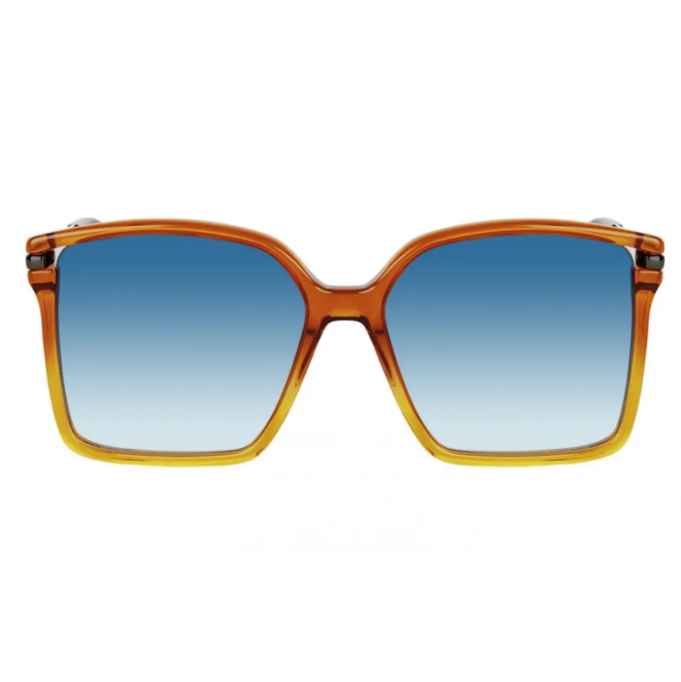 GV Light sunglasses with a square frame in injected orange and honey-colored acetate with a dégradé effect, with a decorative carving on the side of the circles, smoked gray lenses, gold-plated metal temples and black acetate ends. Signature GIVENCHY engraved on the left rod. Sold with a hard case.