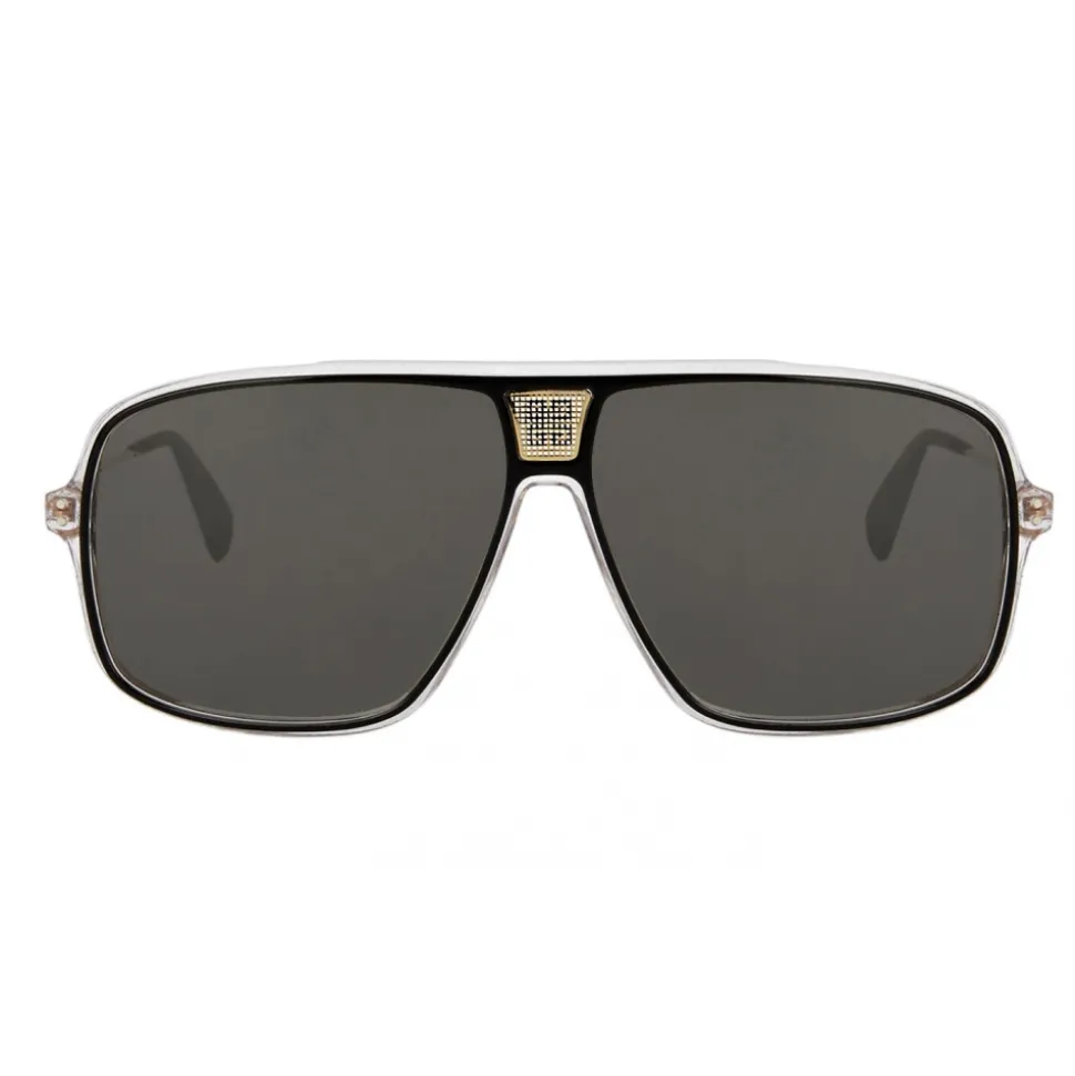 Unisex GV Mesh sunglasses with transparent and black acetate frame, gold metal mesh insert with black 4G logo on the bridge, silver mirror lenses, gold-plated metal temples with laser-printed 4G logo and acetate end pieces black. Sold with a hard case.