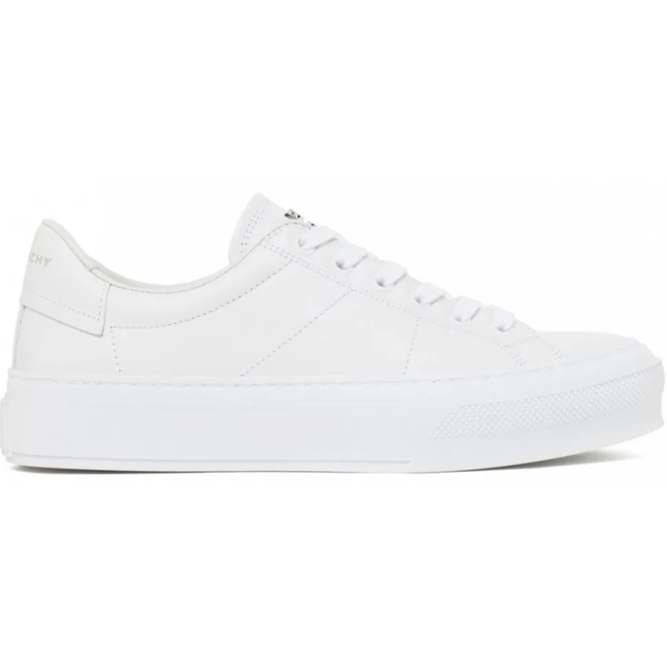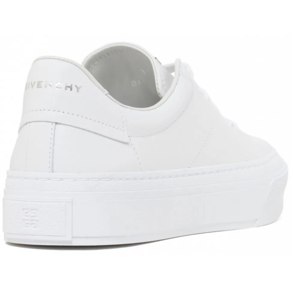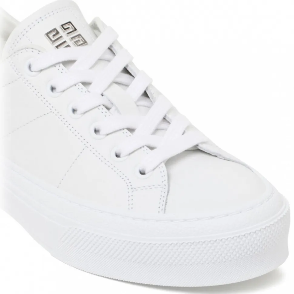 Givenchy White City Sport Low Top Sneakers. White calfskin low top sneakers, front lace up fastening, round toe. 4G logo in silver metal on the tongue, silver brand signature on the back. Leather insole with embossed brand 4G signature, rubber sole, 4G logo embossed on the back.