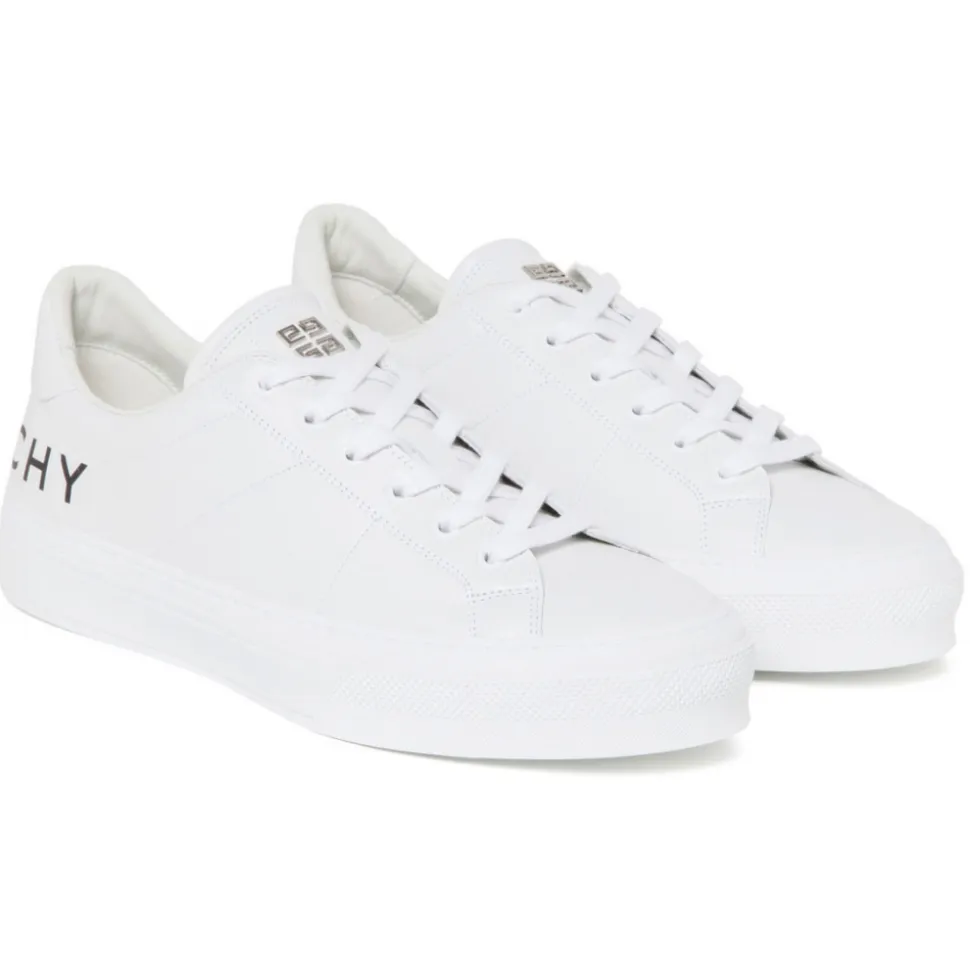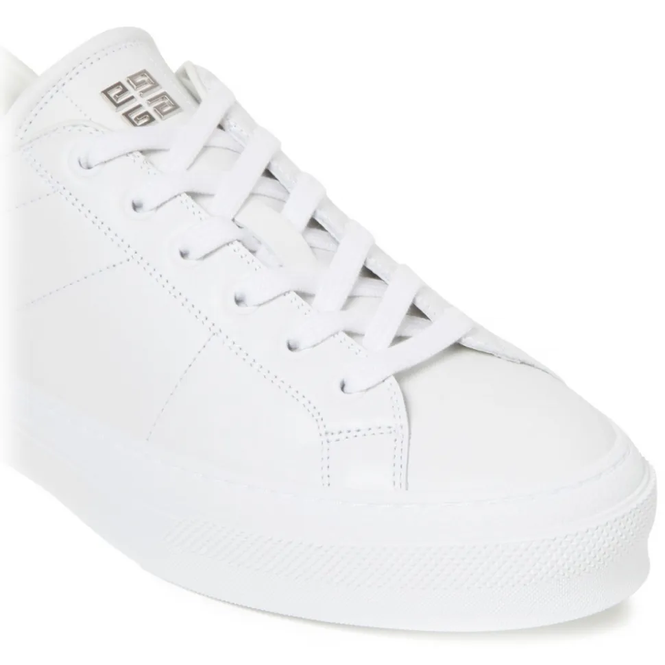 Givenchy White City Sport Sneakers. White calf leather low top sneakers, front lace up fastening, logo print at the tongue, logo print to the rear, signature 4G motif, tonal stitching, round toe, branded leather insole, chunky rubber sole.
