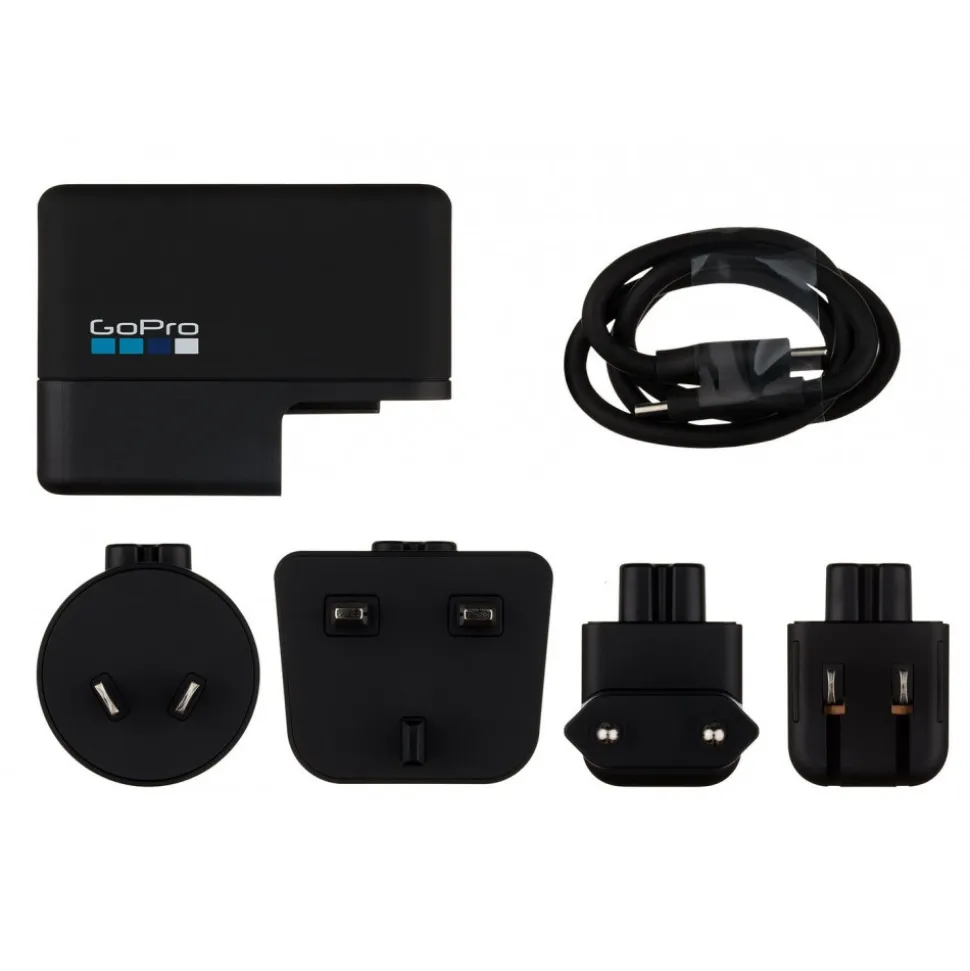 The fastest way to charge your GoPro, the 27.5W Supercharger (International Dual-Port Charger) lets you charge two GoPro devices simultaneously—anywhere in the world. The USB-C port offers 20 to 70% faster charging on fast-charge compatible devices1 compared to using a conventional charger.2 You can also continuously power your GoPro during longer captures. Includes interchangeable AC plugs for US, UK, EU and AU style wall sockets.