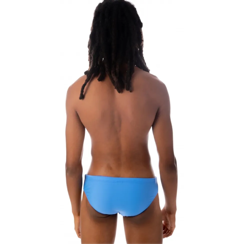 Electric blue stretch swim briefs with lace and Grace rainbow application.