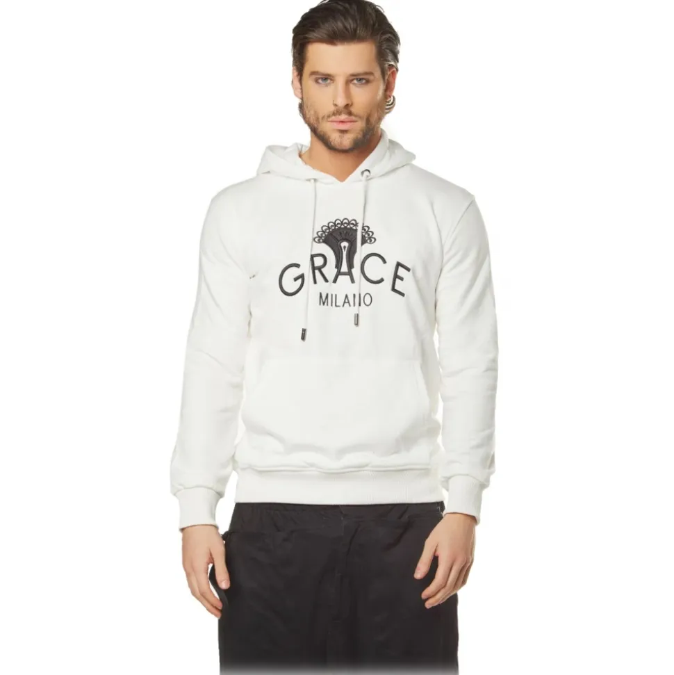 White unisex hoodie in 100% cotton. Medium fit. Drawstring with silver metal ends on the hood. Large front pocket. Black Grace Milano embroidery on the front.