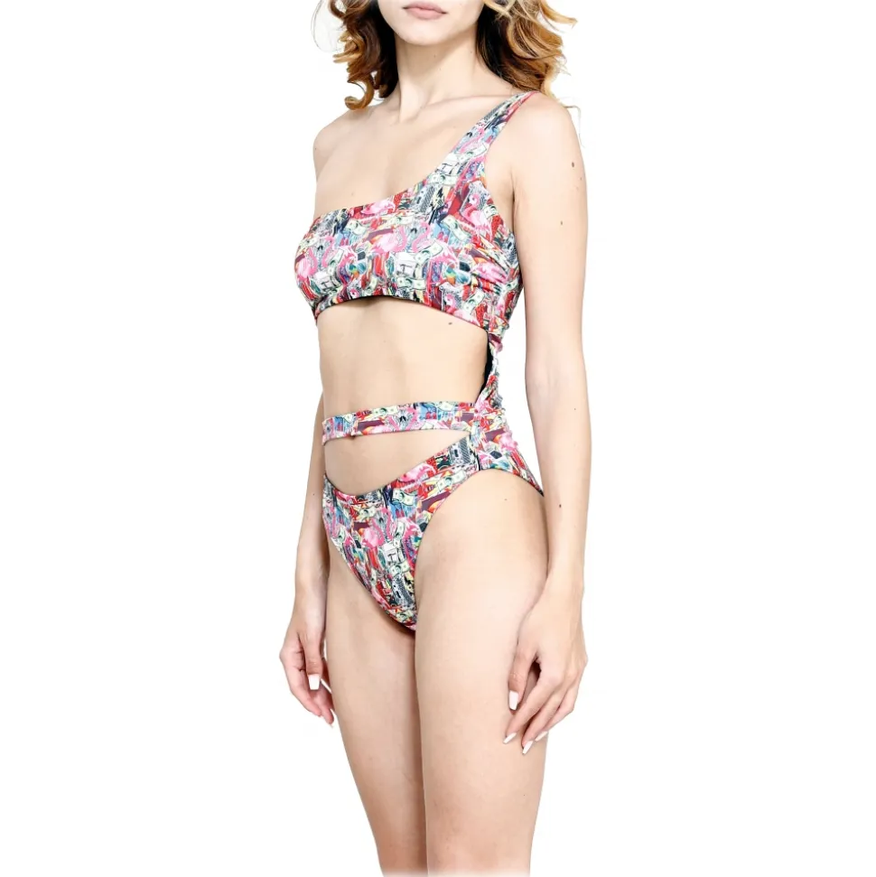 One-shoulder high-cut trikini with front cut-out effect and waist band.