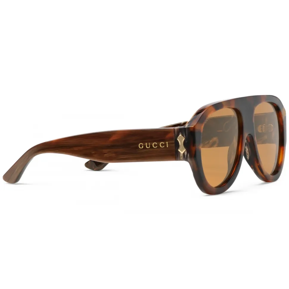 Bold aviator sunglasses are presented in an unexpected combination of tortoiseshell and wood effect acetate, playing with different finishes and shades of brown. Oversize gold-toned rivets and engraved Gucci script on the temples enrich the accessory, while the burgundy acetate nose pad adds a playful contrast.