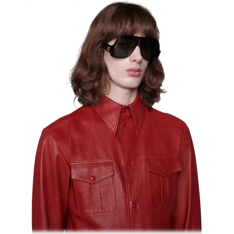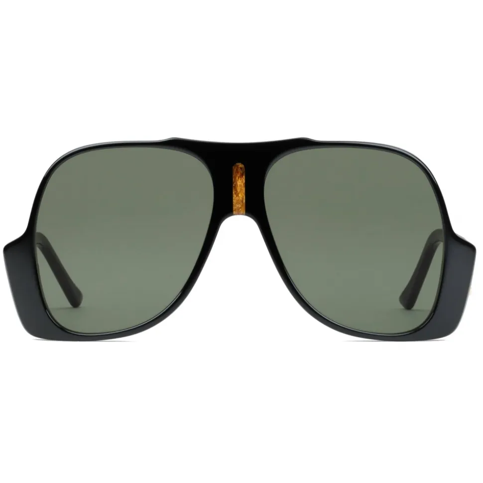 An inlaid acetate detail with wooden effect decorates the front of these aviator sunglasses, crafted from shiny black acetate. Green lenses and the emblematic Interlocking G logo placed on the temples complete the design.