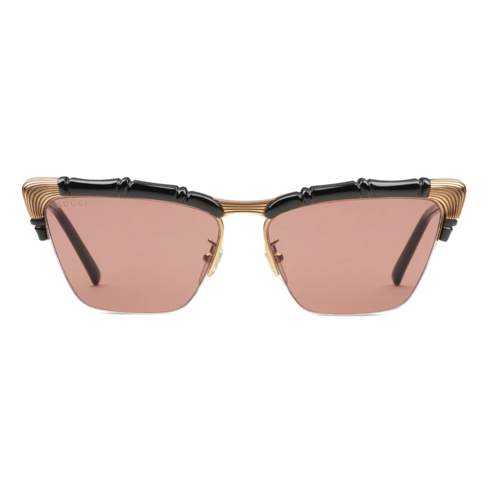 Black cat-eye frames are carved into a bamboo effect design with gold-toned metal details, complemented by brown lenses. Bamboo was originally incorporated into Gucci’s collections in 1947 and soon became one of the most recognizable House emblems, often reworked in unexpected ways.