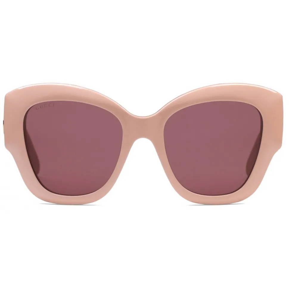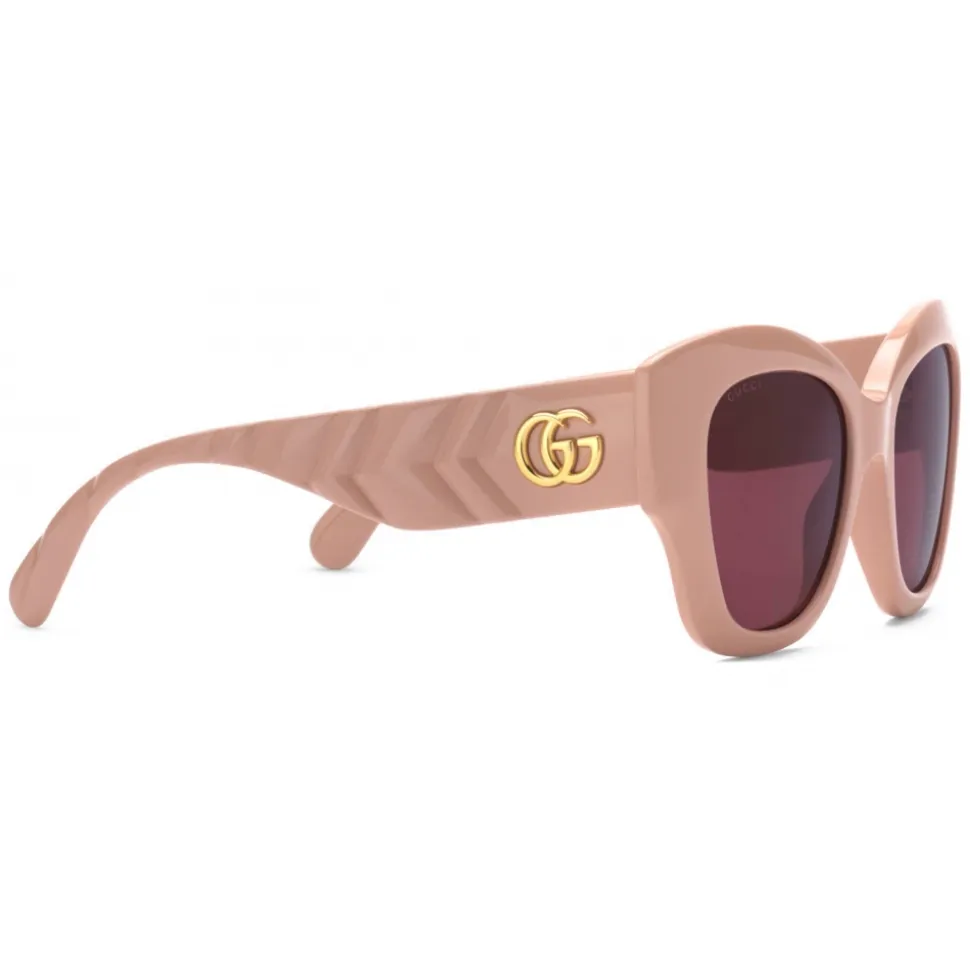 Influenced by the coveted styles of the ’50s and ’60s, the cat eye glasses are designed with a bold, oversize shape in pink. Inspired by the coveted GG Marmont handbags and accessories collection, the temples have a matelassé quilted effect accented by the Double G hardware—two distinctive elements of the line.