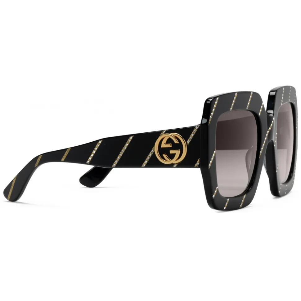 Crafted from black acetate, Gucci’s distinctive oversize square sunglasses are enriched by a crystal Regimental stripe motif, decorating the frame and the temples. Shaded lenses add a subtle contrast to the pop inspired shape, while the emblematic Interlocking G enhances the temples.