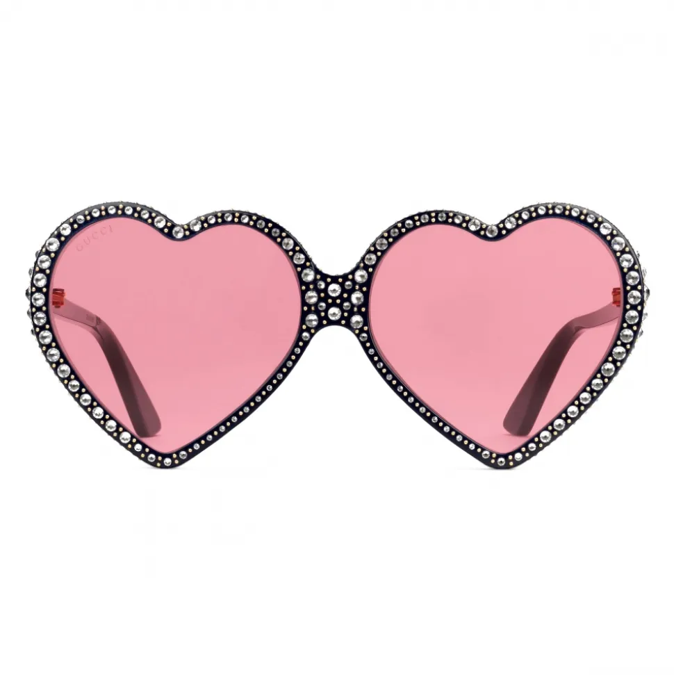 These dark blue glitter sunglasses are imbued with a pop inspired feel with a heart-shaped frame and embellished with allover crystals. Cherry red lenses complete the look.