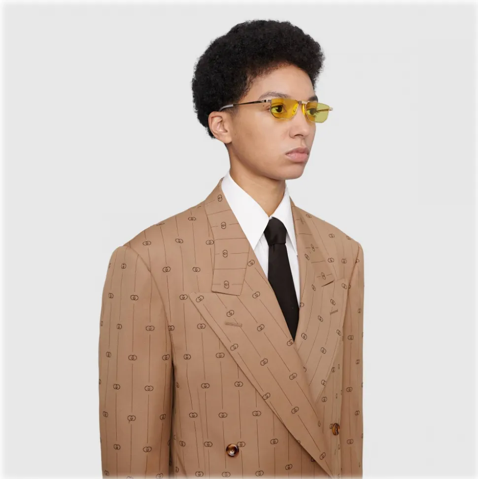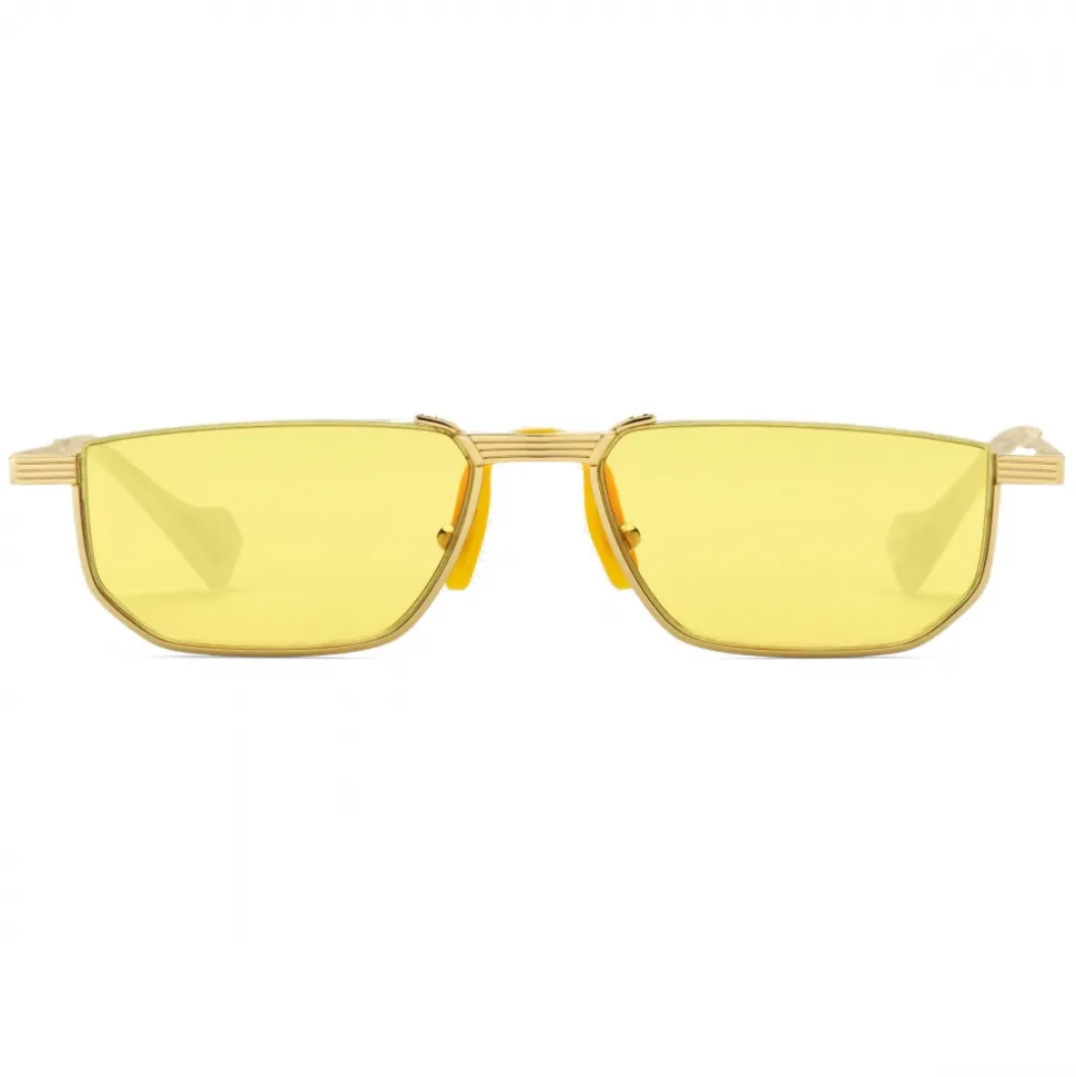 Bridging the past with the present, these sunglasses are inspired by vintage reading glasses and reimagined through the Gucci lens. Crafted from gold-toned metal, the subtle frame features engraved details that add a precious feel, while the yellow rubber nose pads are a nod to specialty eyewear. A mother of pearl effect acetate tip completes the molded temples.