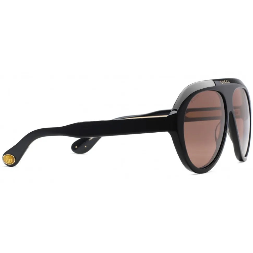 Repeated in the center of an enamelled oval, the Double G is part of the Gucci codes from the 70s archives. Here, the guilloche processing detail defines the ends of a pair of black acetate navigator sunglasses. The Gucci logo emphasizes the upper bar.