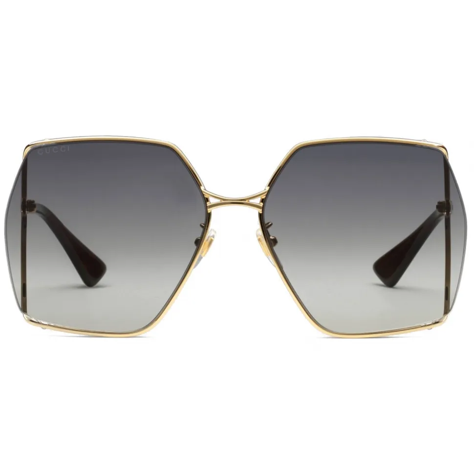 Influenced by the retro undertones that run throughout the collection, these graphic oversize grey lenses are framed by thin gold-toned metal. The temples are enriched with a petite ‘Gucci’ engraving and contrast tips.