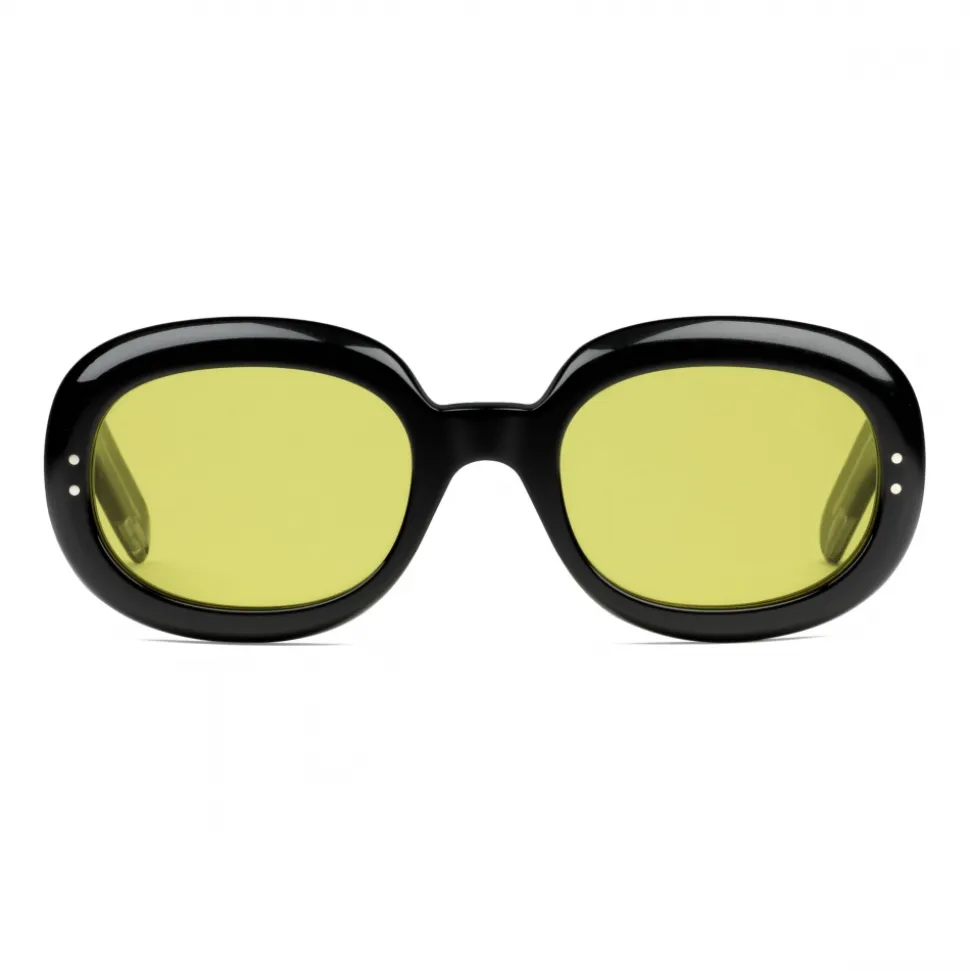 Reminiscent of the nineties’ coveted shapes and colours, these oval sunglasses play with contrasting hues – the black acetate frame with yellow lenses. The gold-toned Gucci logo embellishes the temples.