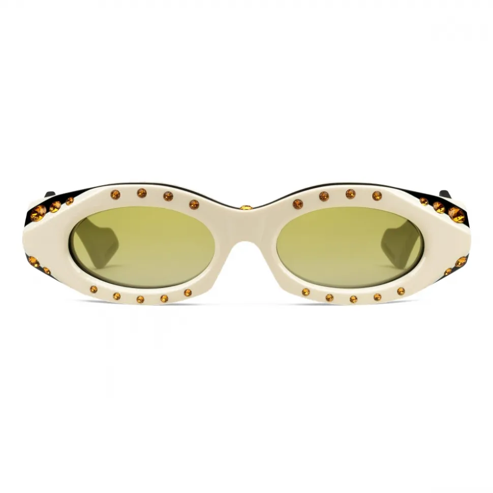 These Hollywood Forever sunglasses are crafted from triple layered, bi-colour acetate and enriched by dark yellow Swarovski crystals. Rounded edges in contrast colours lighten the geometric frame. A sophisticated play on the classic eyeglass chain, the temple tips feature a cut-out segment that allows the shades to be carried around the neck with a twill neck bow.