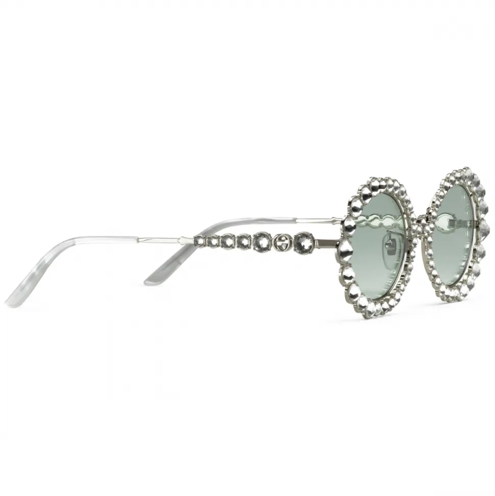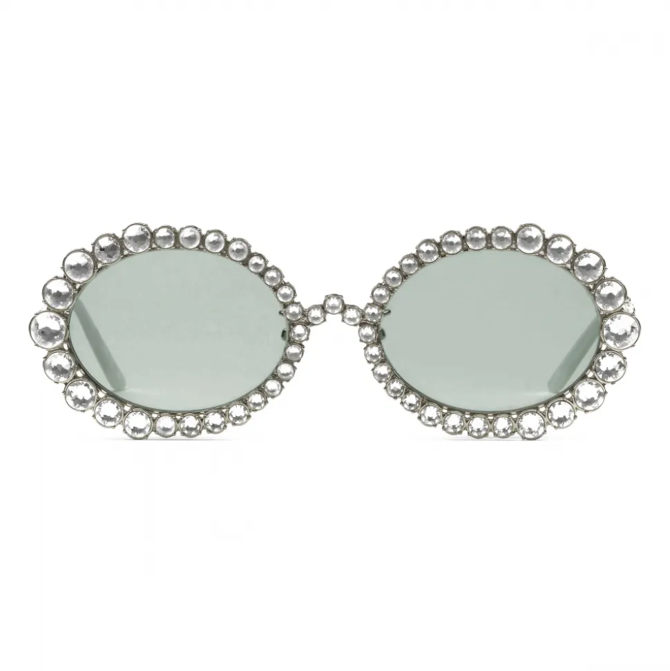 A glimmering pair of sunglasses, with a silver-toned metal oval frame and temples, are encrusted with white crystals. A subtle detail, the Interlocking G logo further enriches the temples.