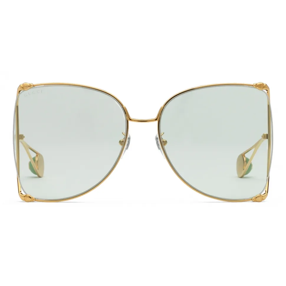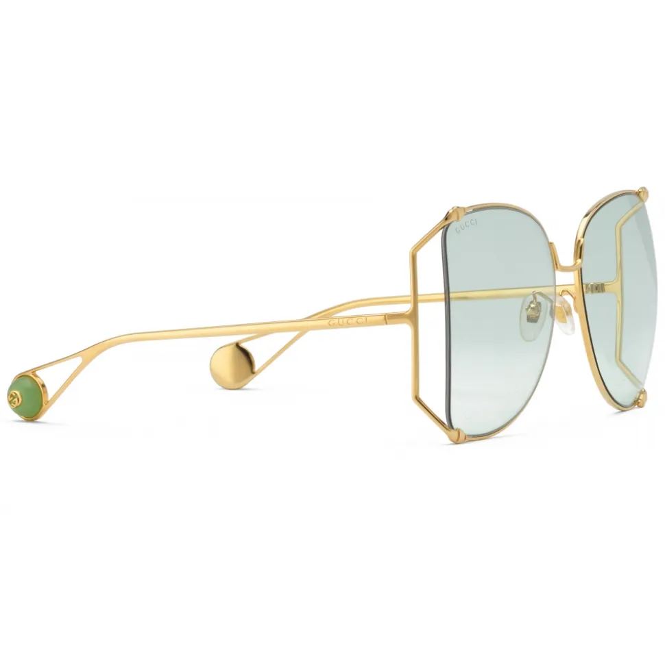 Defined by a butterfly-shaped design, the oversize gold-toned metal sunglasses’ temple tips feature a light green resin pearl matching the color of the lens. The House’s distinctive logo, the Interlocking G further enhances the accessory.