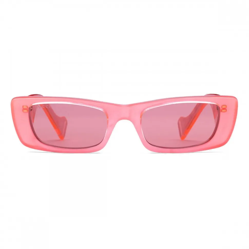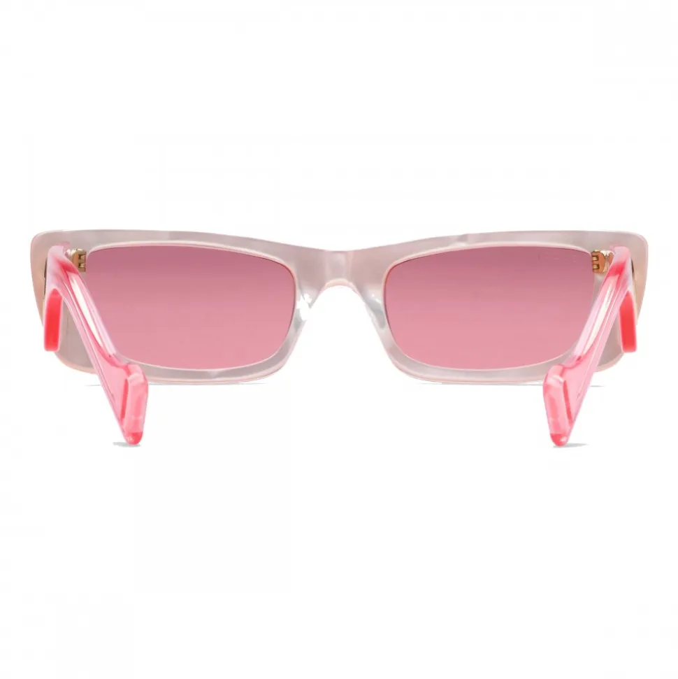 Inspired by shapes and colors typical of 90s accessories, these rectangular sunglasses are presented in a series of fluorescent colors. In a play of contrasts, the frame and the pink acetate temples of this model combine with a layer of white mother-of-pearl effect acetate, which defines the interior.