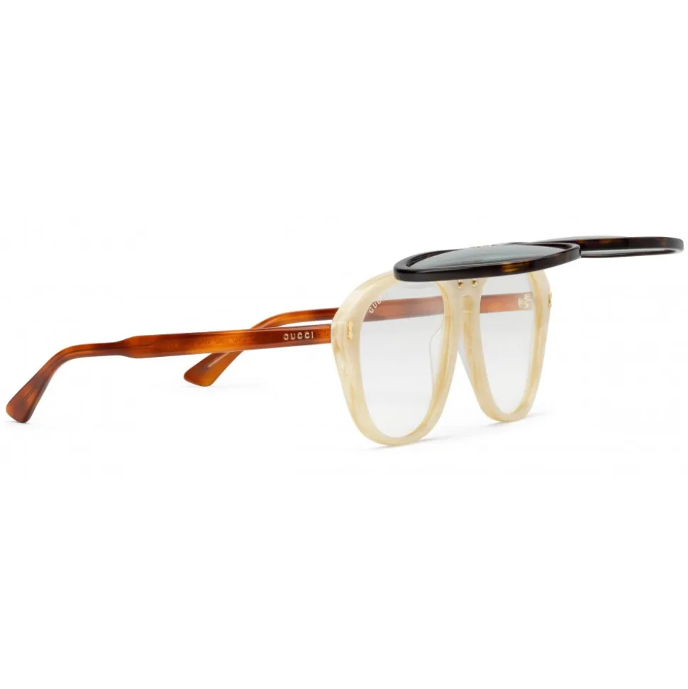 Dark tortoiseshell acetate frame with flip-up detail