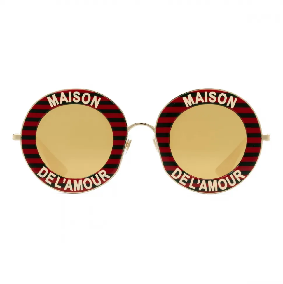 Bold round frames influenced by the popular styles of the 1960s are enriched within the House narrative. The metal-rimmed frames feature striped trims surrounding yellow lenses that enhance their retro infused feel. The phrase “Maison de l’Amour” surrounds each lens—a recurring motto of the House that decorates ready-to-wear and accessories.