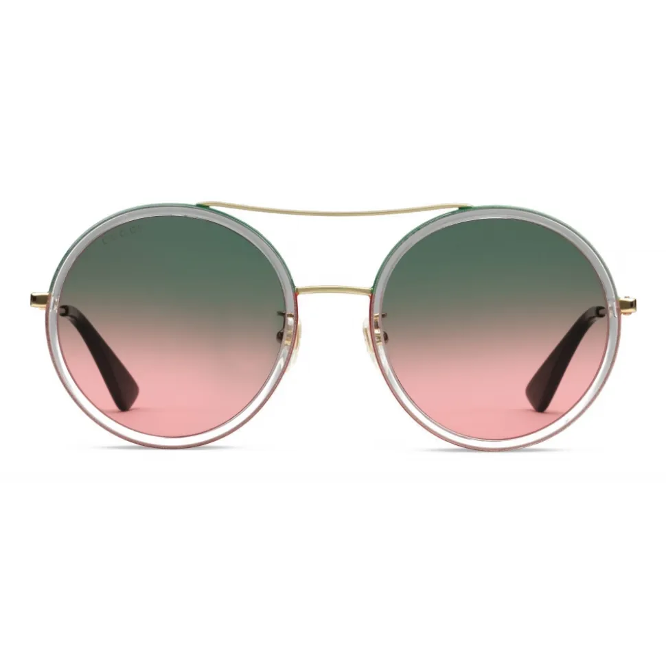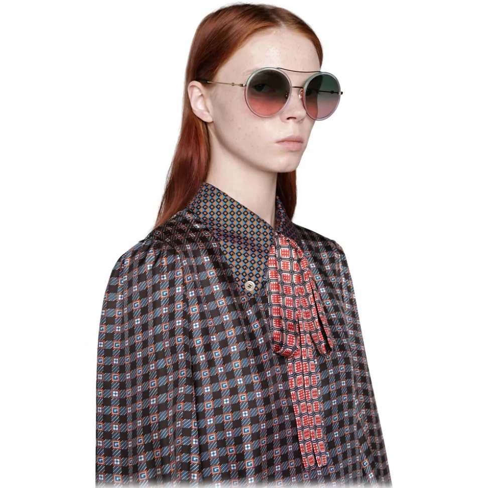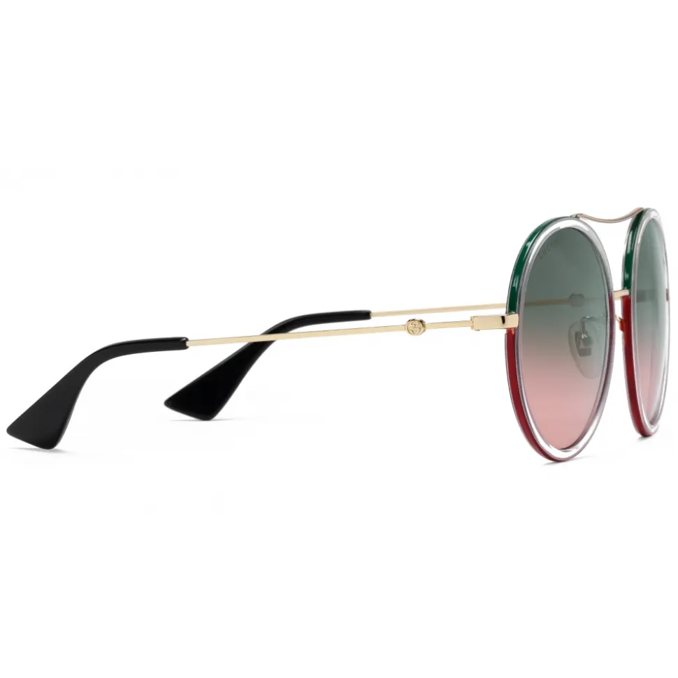 The House’s archival Web stripe inspires the green and red enamel details decorating the gold-toned metal frame of these round sunglasses. Green and pink shaded lenses add dimension to the design, completed by the Interlocking G logo at the temples.