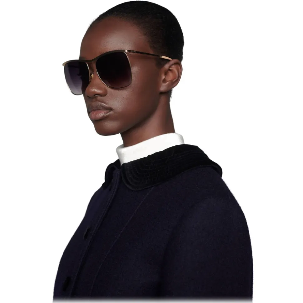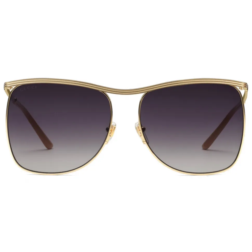 Square-shaped grey shaded lenses are framed by thin gold-toned metal with an engraved design that lends texture to the streamlined shape. Slim temples are further enhanced by black enamel stripes and a petite Interlocking G detail.
