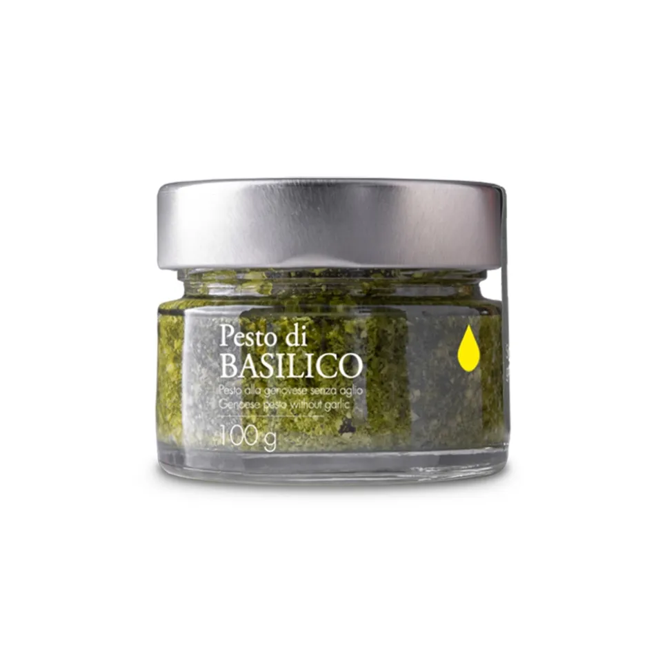 Genoese-style basil pesto without garlic. Only ingredients of the original recipe, basil, Parmigiano Reggiano DOP, pine nuts and extra virgin olive oil.