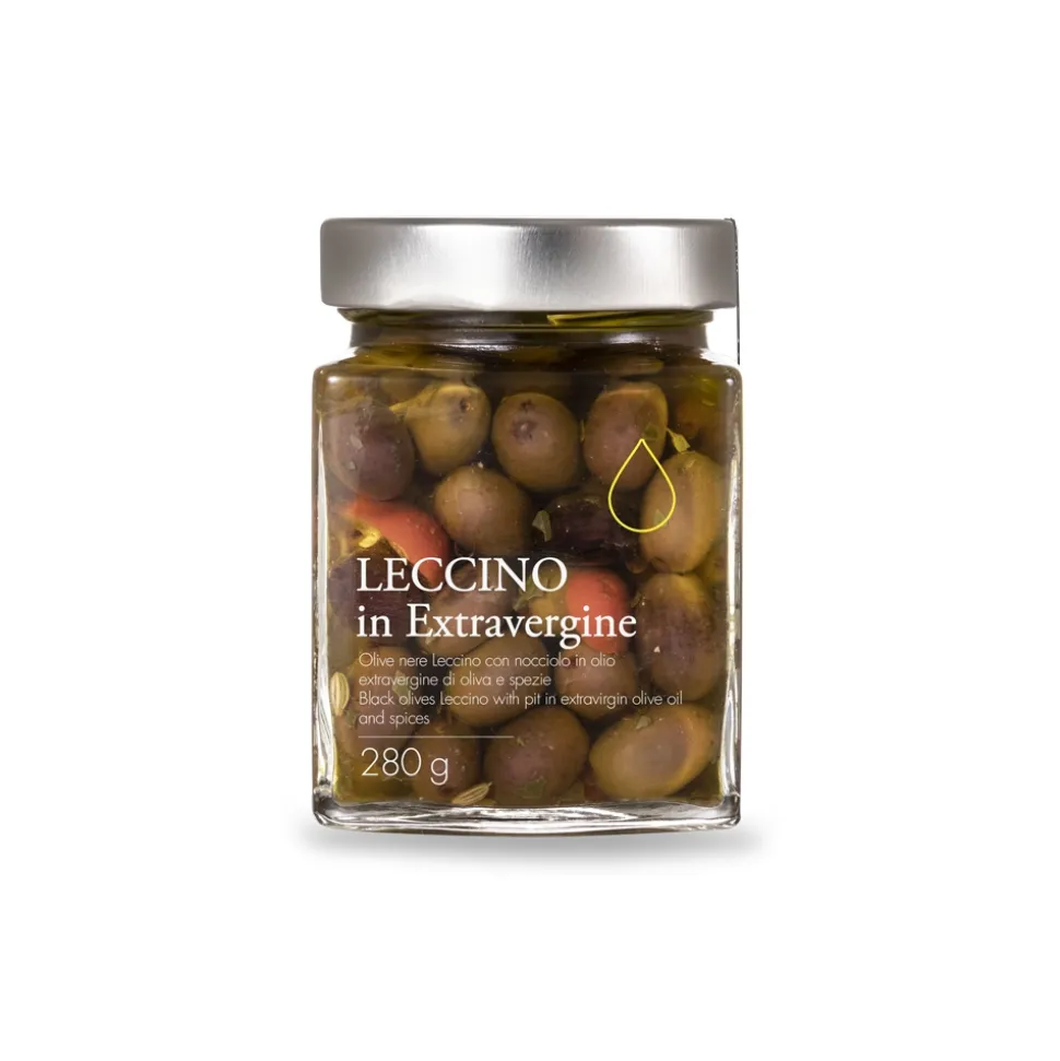 Leccino black olives seasoned in extra virgin olive oil, they are ideal for appetizers and salads, in pasta dishes and in sauces, excellent with fish roasts and Livorno style stockfish, or in meat dishes such as stewed wild boar and lamb.