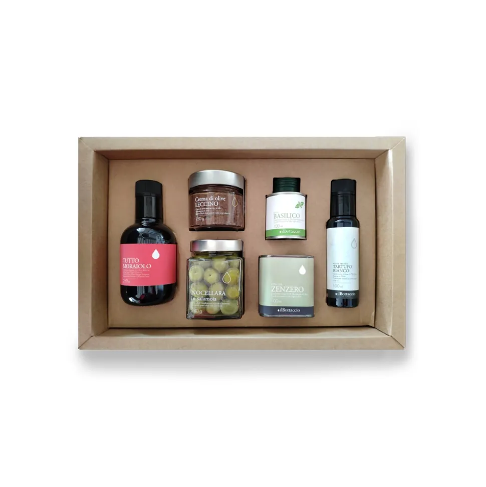Gift box based on products with extra virgin olive oil, consisting of Moraiolo monocultivar oil, olives, olive pate, basil dressing, ginger dressing and white truffle oil.