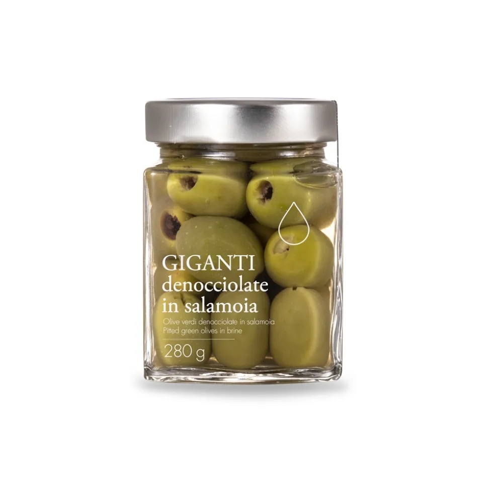 Giant green olives without brine in brine, ideal for cocktails and appetizers, perfect with salads, or to accompany cold dishes.