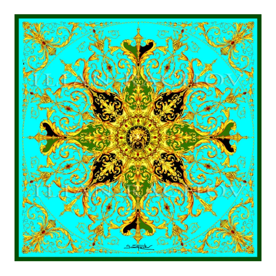 Exclusive Ilian Rachov scarf, Turquoise Rosone motif. Print on 100 % silk.