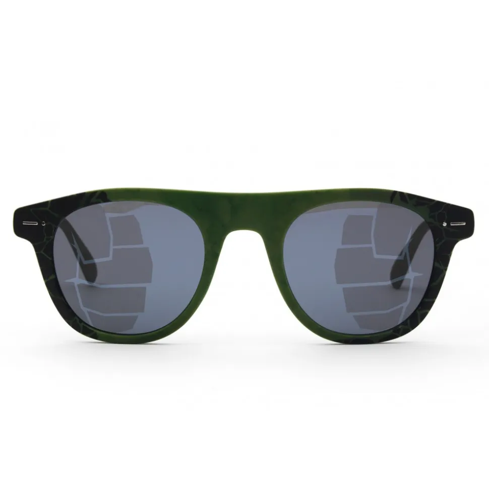 Round sunglasses exclusively customized for the Marvel eyewear collection. On the front and on the temples a dedicated graphic has been applied that refers to the green skin of Hulk. Its characteristic destructive force is represented by the fists with mirrored finish on the lenses and by the logo printed on the terminals.