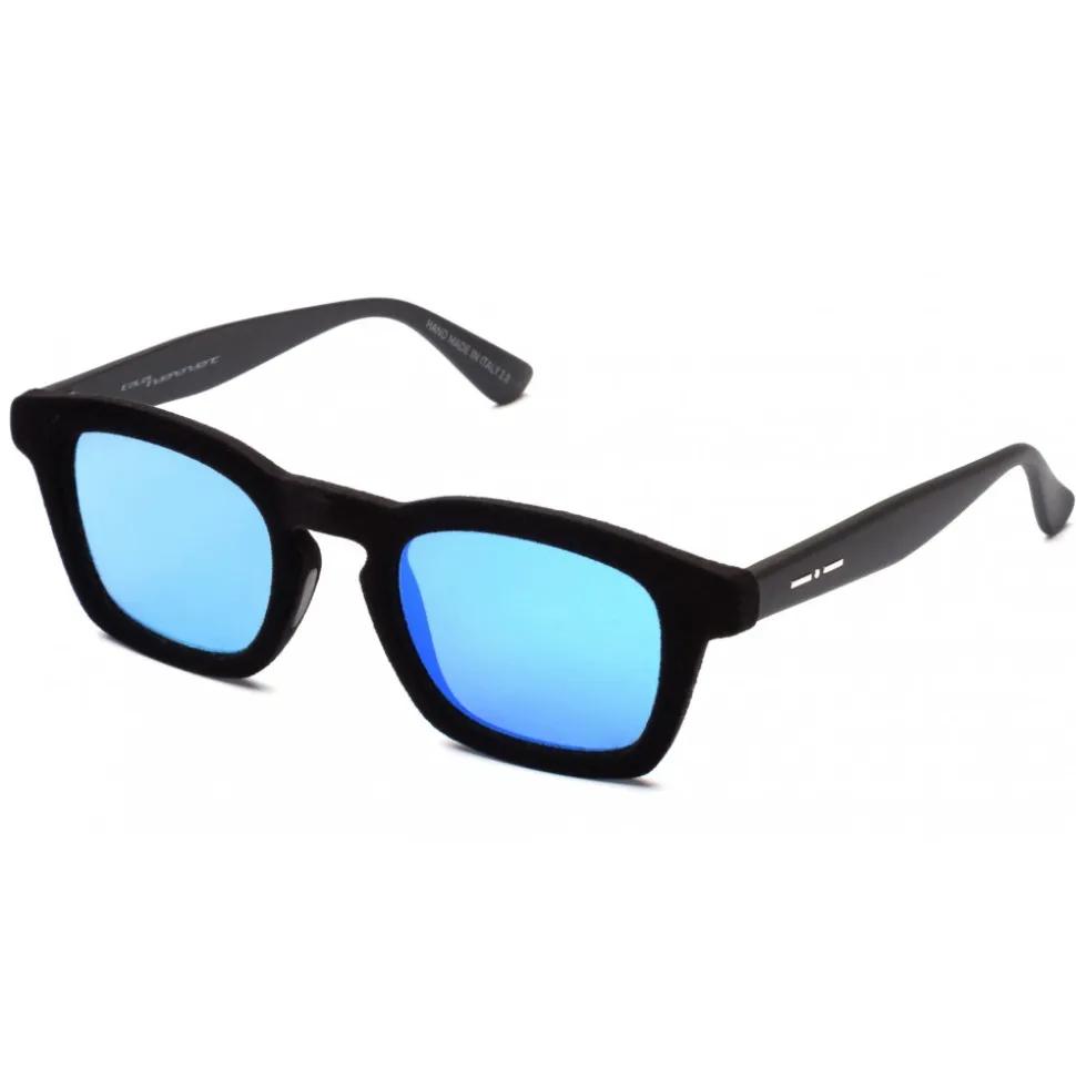 Sunglasses with Velvet Effect treatment. Italia Independent was the first company in the world to introduce the velvet effect in eyewear, starting from a surface treatment already used in the automotive sector, called UV Lux ®. This innovation has allowed the Brand to affirm its notoriety, fed by the continuous research of innovative, unconventional technologies, then applied to its products. This type of finish, which gave birth to the product family called I-V, has recently been the subject of attempts at imitation by prestigious brands, initially skeptical about its use. The process for obtaining the velvet effect is obtained by orientating and projecting particular natural fibers against surfaces coated with adhesive material. The energy needed to orient and accelerate the fiber and make it penetrate into the glued layer is provided by an electrostatic field that is generated between the metering unit and the surface to be covered. Plus versions have an increased effect; the bicolor versions instead combine two different colors on the same surface of the fronts. Technology awarded as innovation of the year by MIT Review Italy in May 2014.