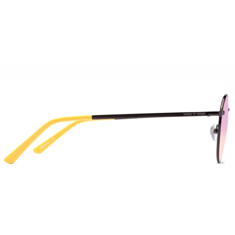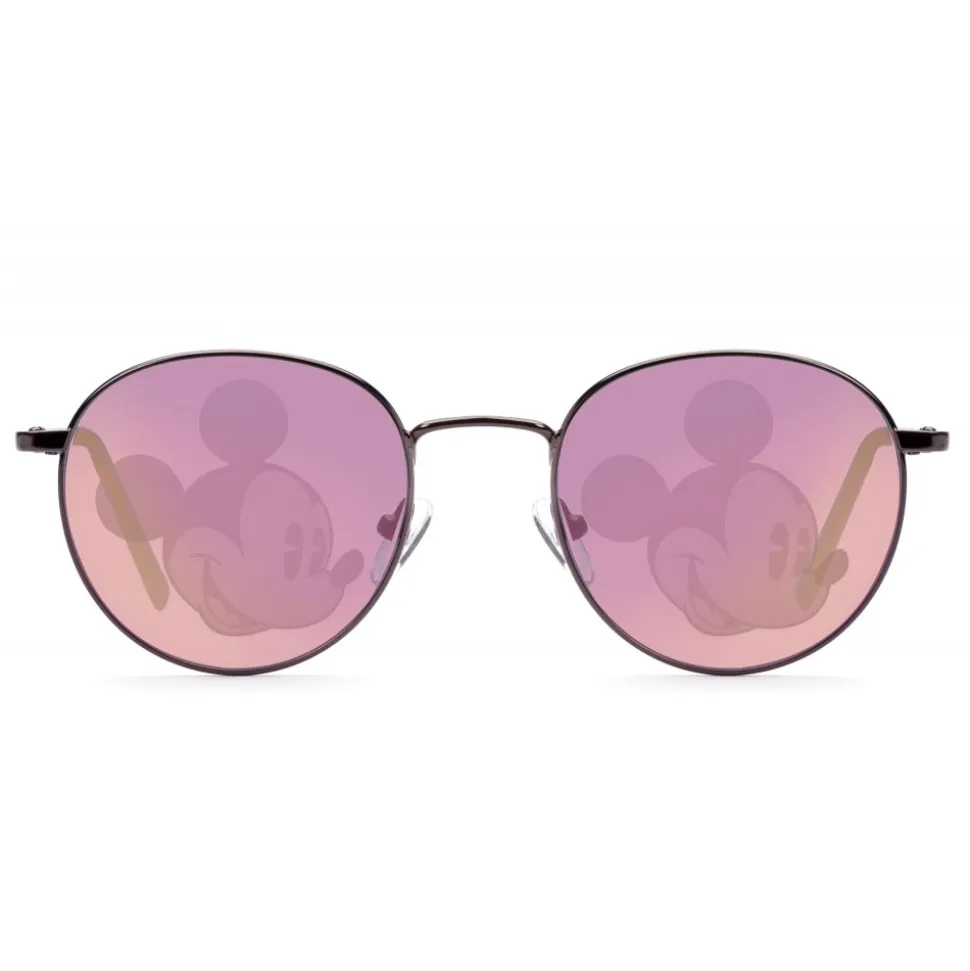 Sunglasses characterized by a minimal design but rich in details. The super thin metal frame is made with Mickey’s iconic colors, on the occasion of its ninetieth birthday. The shiny frames in classic gold, silver and gun colors are combined with colored plastic terminals. Each variant is embellished by the shape of Mickey Mouse imprinted on both mirrored lenses. “Line-point-line” logo in bas-relief on both temples.