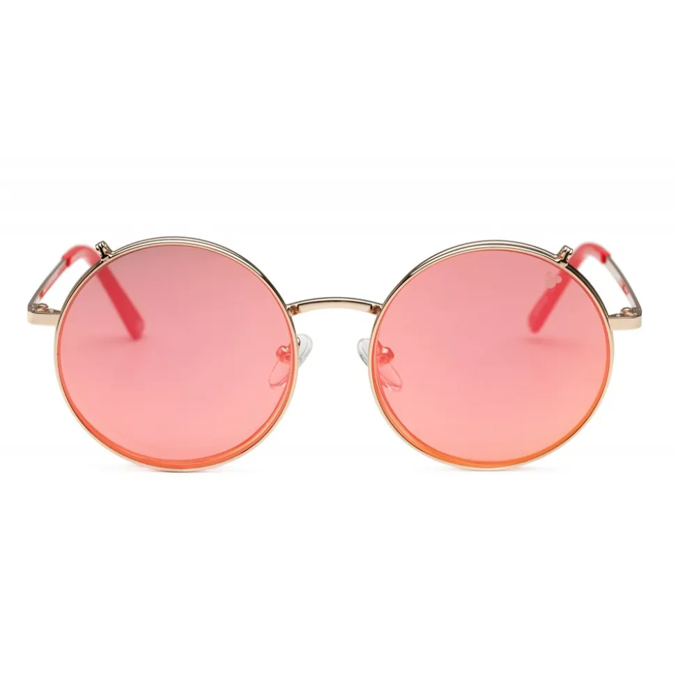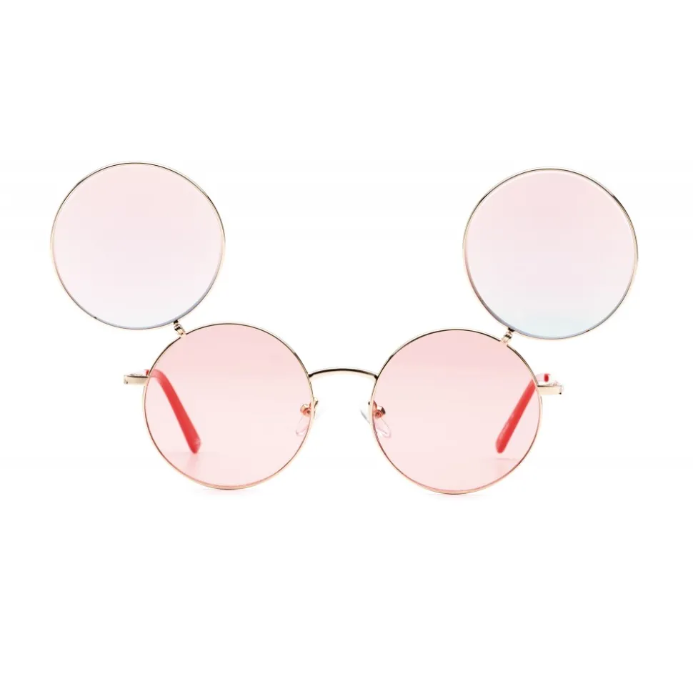 Sunglasses characterized by a minimal design but rich in details. The super thin metal frame is made with Mickey’s iconic colors, on the occasion of its ninetieth birthday. The peculiarity of this model is the flip up: overlapping of two pairs of lenses that, once opened, resemble the ears of Mickey Mouse. The shiny frames in classic gold and gun colors are combined with colored plastic terminals. The two color variants are embellished by the icon of Topolino laser on the lenses. “Line-point-line” logo in bas-relief on both temples.