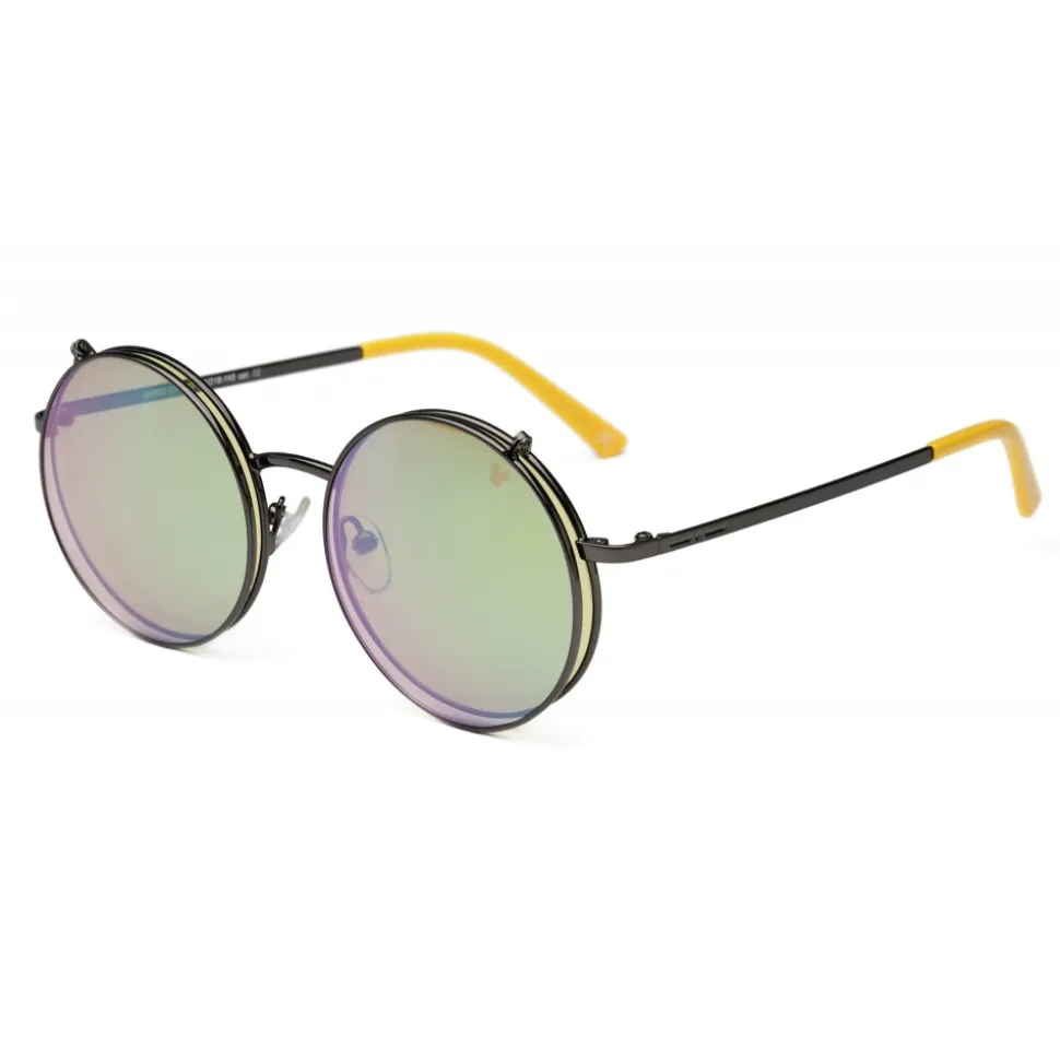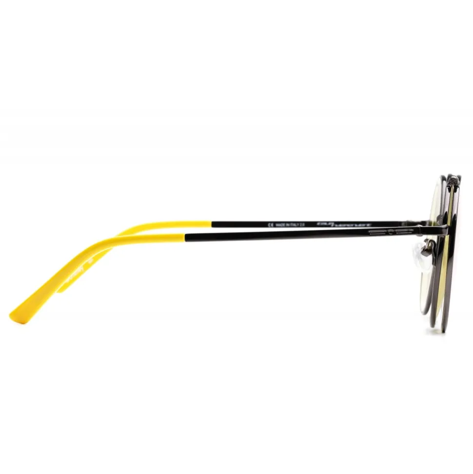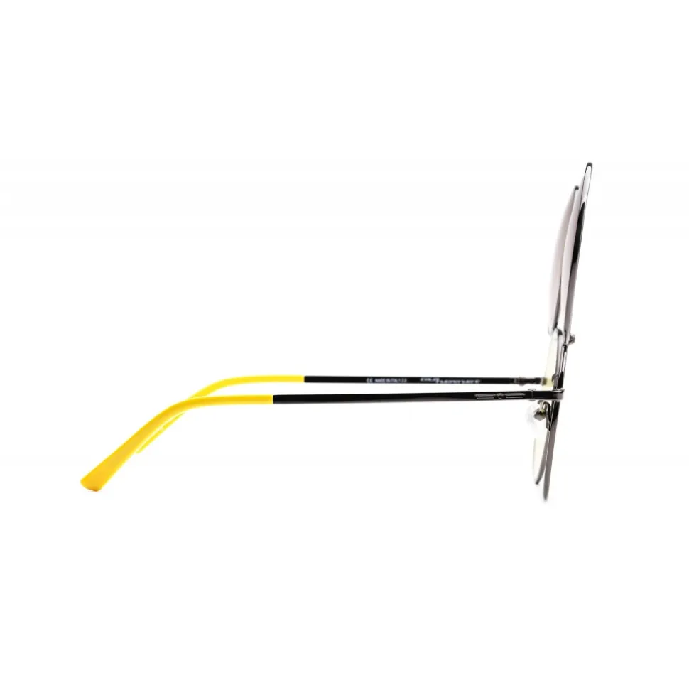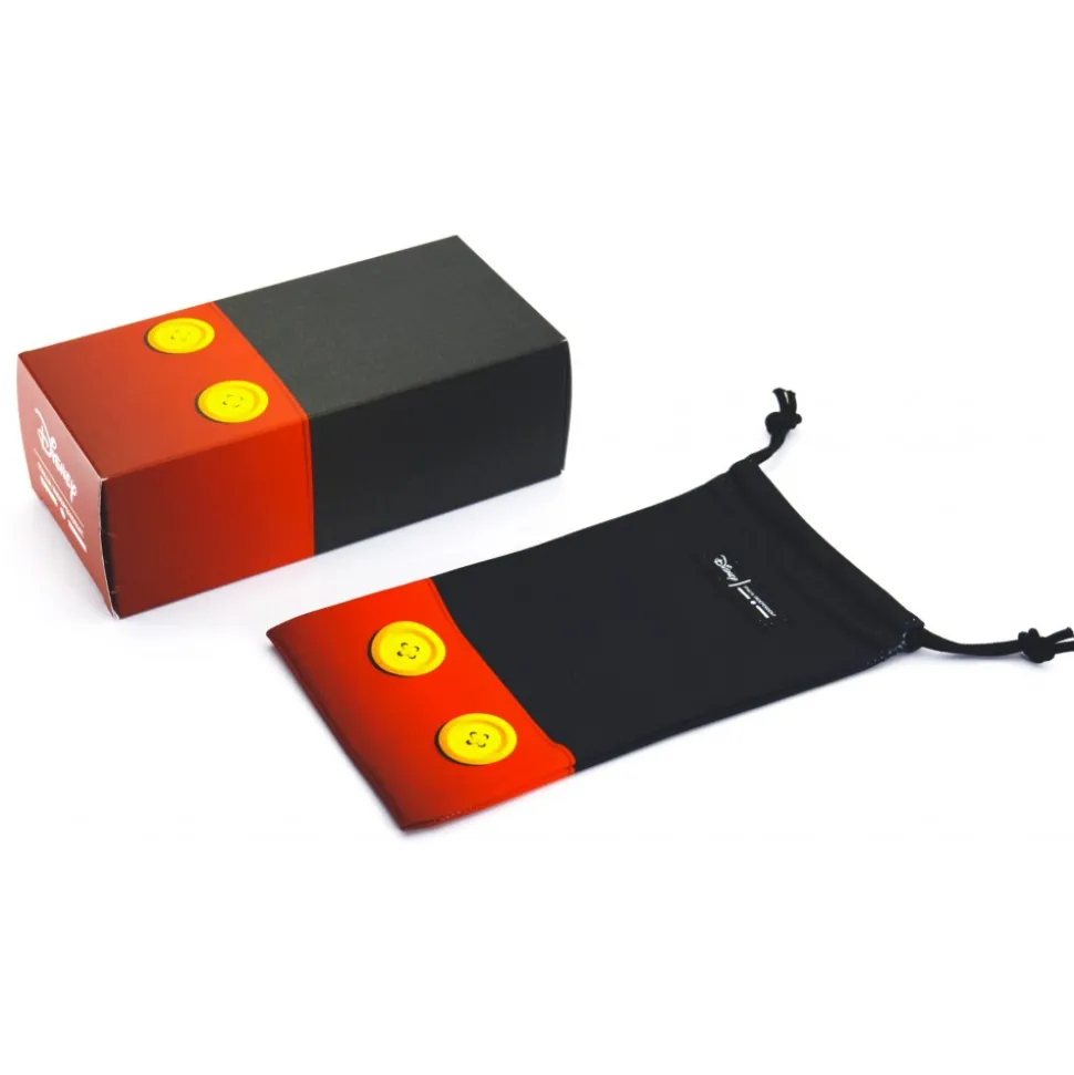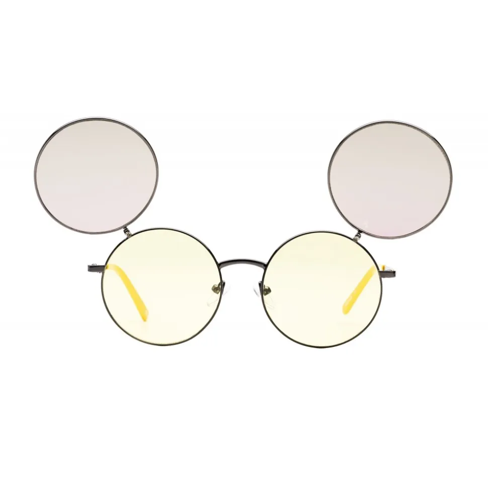 Sunglasses characterized by a minimal design but rich in details. The super thin metal frame is made with Mickey’s iconic colors, on the occasion of its ninetieth birthday. The peculiarity of this model is the flip up: overlapping of two pairs of lenses that, once opened, resemble the ears of Mickey Mouse. The shiny frames in classic gold and gun colors are combined with colored plastic terminals. The two color variants are embellished by the icon of Topolino laser on the lenses. “Line-point-line” logo in bas-relief on both temples.