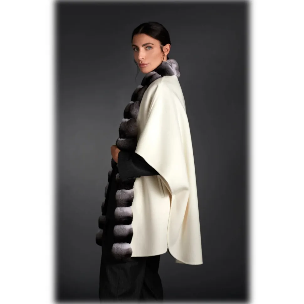 The natural black and white chinchilla fur adds a touch of refinement and glamor to the garment, while the double-faced high-quality cashmere fabric offers comfort and softness.