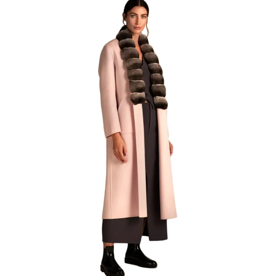 The Clarissa cashmere coat with chinchilla shawl collar enchants with its elegance and refinement. 123 cm long, with a linear design for a classic and feminine style.