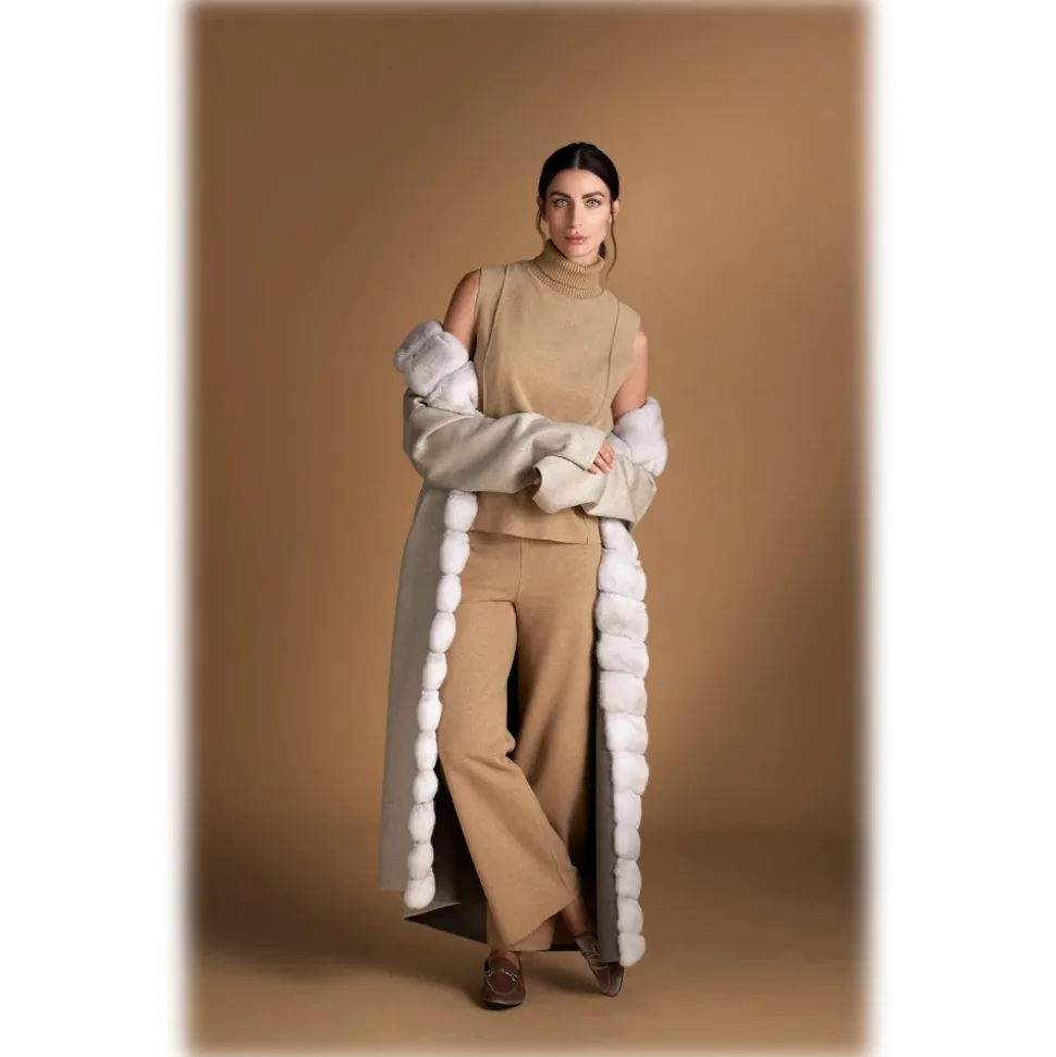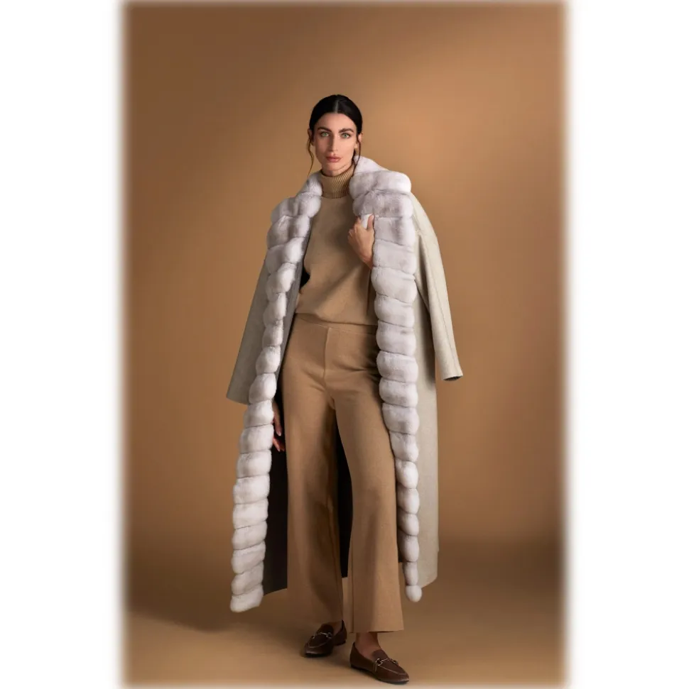 The long Cristina coat with chinchilla fur is an elegant statement of style and luxury. 128 cm long, with a large design for timeless elegance.